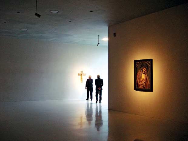 Phòng trưng bày được chiếu sáng chỉ bằng nguồn sáng tự nhiên với ô lấy sáng trên cao, ánh sáng được lọc và tán đều qua lớp kính mờ, tạo nguồn sáng lý tưởng, không gây bóng đổ lên tác phẩm trưng bày. Tiếp theo là phòng trưng bày kết hợp ánh sáng tự nhiên và ánh sáng nhân tạo. Nguồn sáng nhân tạo định nghĩa không gian. Khe sáng bậc giật cấp đánh dấu ranh giới không gian trưng bày. Cuối cùng là gian triển lãm với màn trình diễn của ánh sáng nhân tạo và tác phẩm.