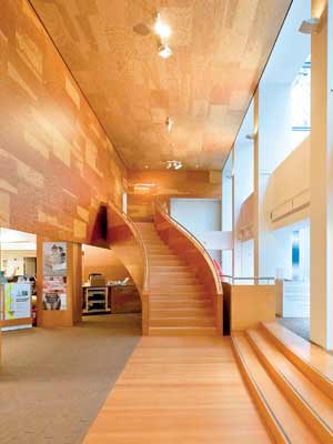 Phòng trưng bày nhỏ với ô lấy sáng trên cao. Phòng trưng bày trung tâm có chiều cao 22m / Nội thất nhà hàng với tầng lửng bọc đồng hướng tầm nhìn về phía dòng suối Aa.