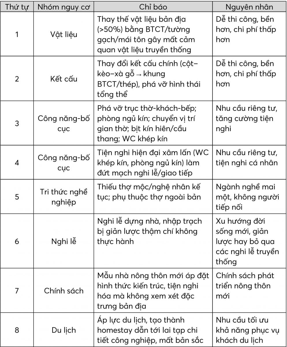 Các nhóm nguy cơ chính dẫn đến sự mai một kiến trúc nhà sàn người Thái được trình bày tóm tắt trong Bảng 2.