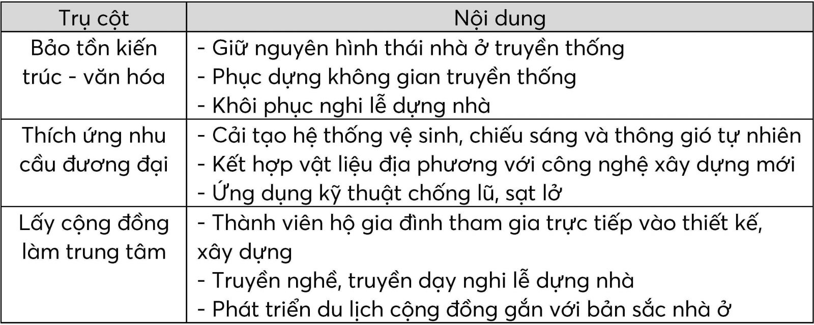 2. Thích ứng với nhu cầu đương đại: Nhà ở truyền thống cần được điều chỉnh để đáp ứng các tiêu chuẩn tiện nghi hiện nay như thông gió, chiếu sáng, vệ sinh, an toàn phòng cháy chữa cháy và khả năng chống chịu thiên tai, biến đổi khí hậu. Việc cải tạo có chọn lọc, kết hợp vật liệu địa phương với công nghệ xây dựng mới sẽ giúp nâng cao chất lượng sống mà vẫn giữ được tinh thần kiến trúc bản địa.