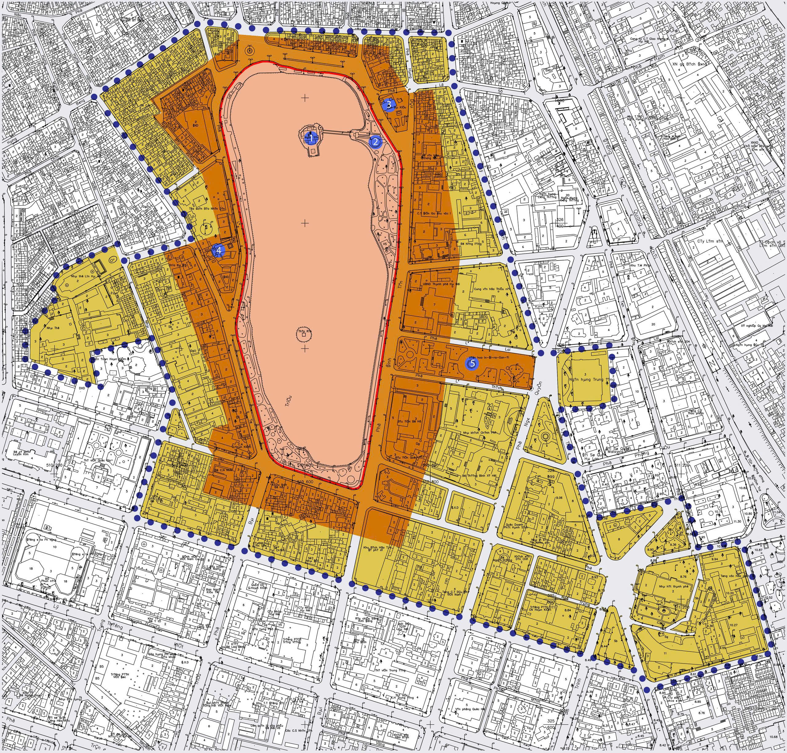– Buffer Zone: Gồm các tuyến phố bao quanh Hồ là không gian chuyển tiếp giữa lõi di sản và các vùng chức năng khác, có thể áp dụng các giải pháp bảo tồn thích ứng như cải tạo mặt đứng, tổ chức hoạt động kinh tế văn hóa truyền thống và hạn chế xây mới.