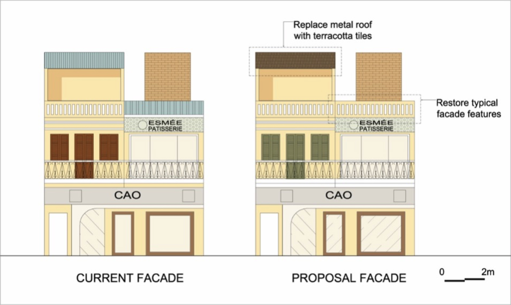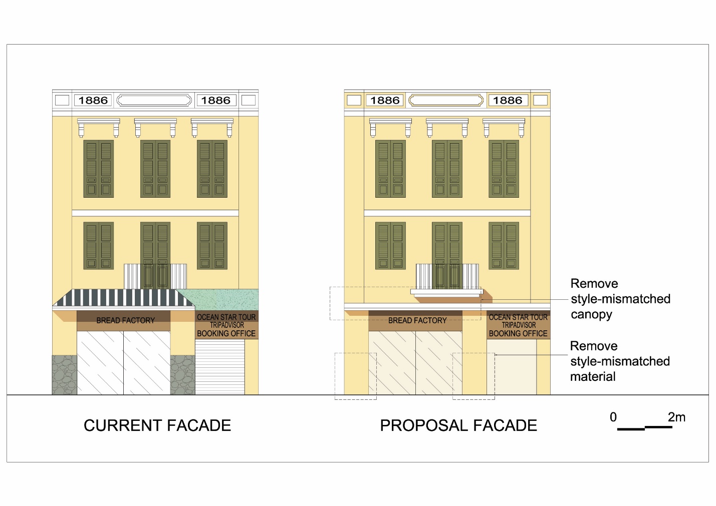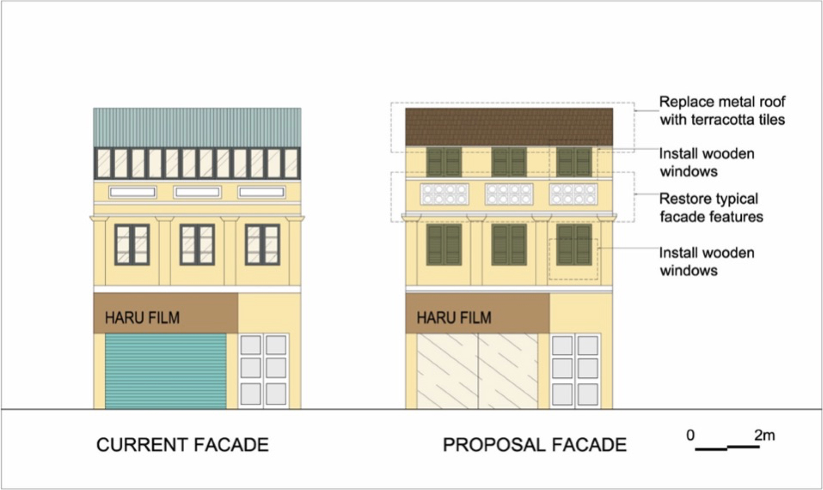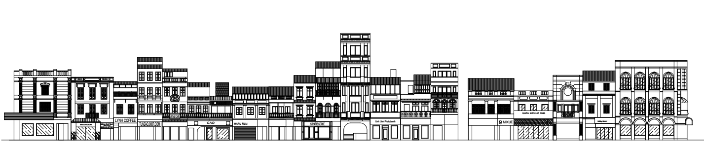 Để cụ thể hóa các nguyên tắc can thiệp bảo tồn thích ứng đối với mặt đứng tuyến phố Hàng Khay, nhóm nghiên cứu đề xuất một bộ giải pháp thiết kế minh họa. Những bản vẽ sau đây mô tả các yếu tố cần được giữ gìn, cải tạo hoặc loại bỏ, nhằm đạt được sự đồng bộ về thẩm mỹ, chức năng và giá trị văn hóa – lịch sử trên toàn tuyến (Các hình 6, 7). Thông qua các bản vẽ minh họa, có thể hình dung rõ nét hơn định hướng cải tạo mặt đứng tầng 1 phục vụ mục đích kinh doanh, đồng thời đảm bảo giữ gìn tính nguyên gốc của các tầng trên. Giải pháp này hướng đến việc tạo lập một tuyến phố thương mại – di sản có bản sắc riêng, hài hòa giữa yếu tố đương đại và lịch sử, góp phần nâng cao hình ảnh đô thị trung tâm Hà Nội.