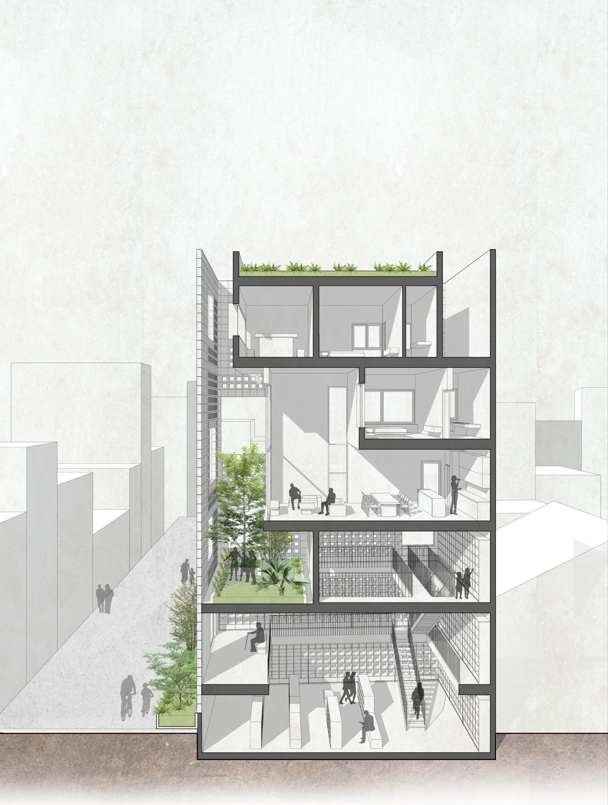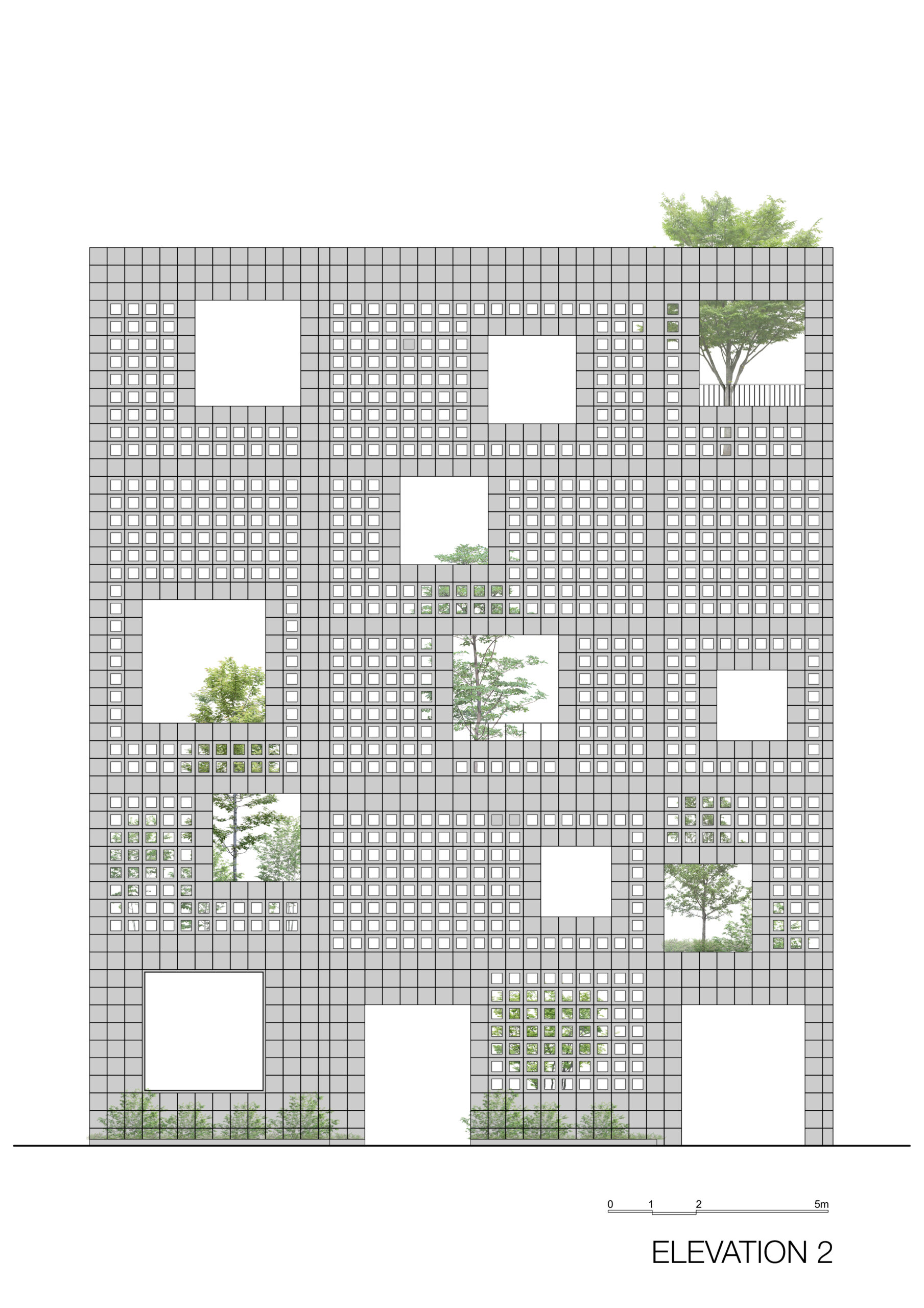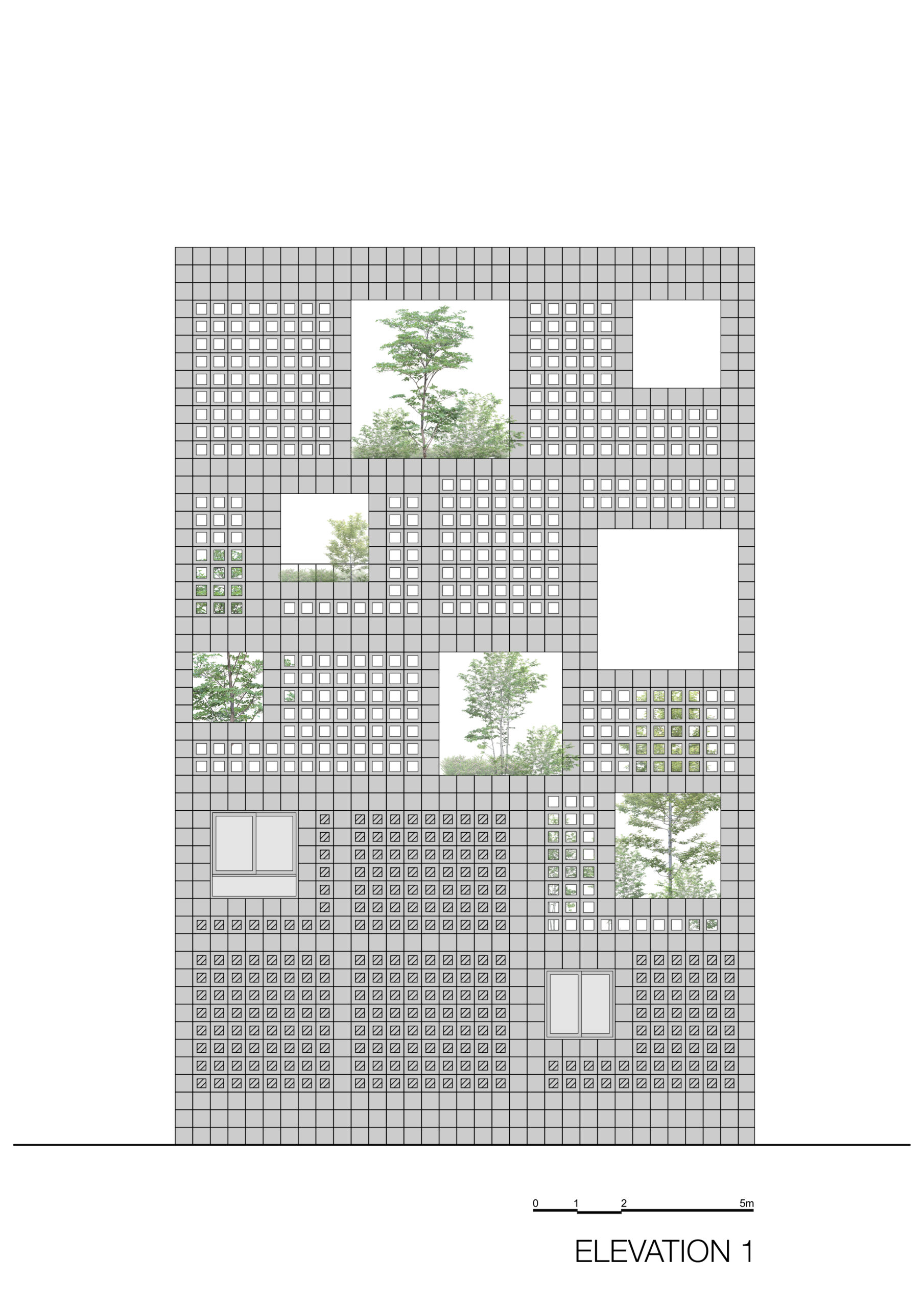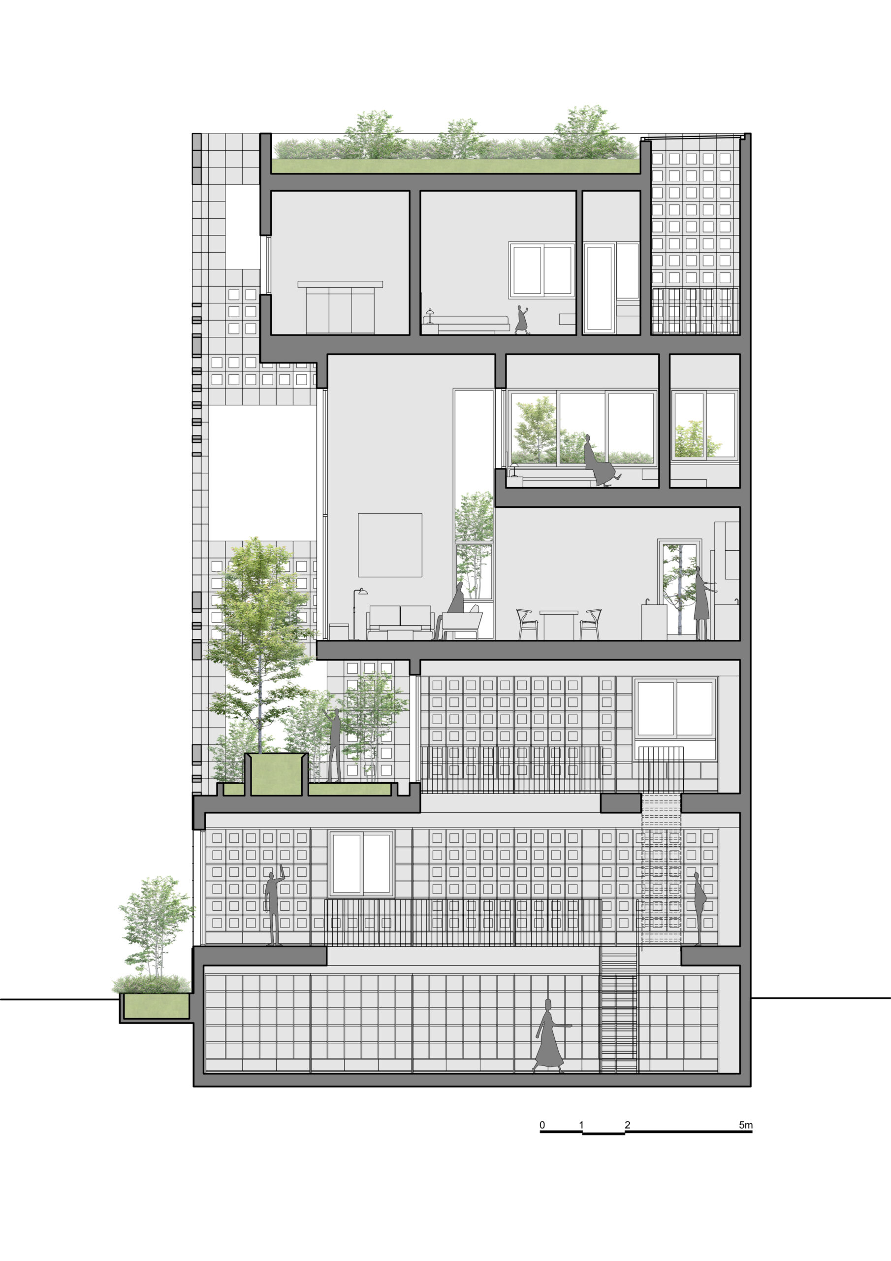 Yếu tố kết nối con người với thiên nhiên, tương tác giữa mọi người trong ngôi nhà được nhóm thiết kế đặc biệt quan tâm. Ngôi nhà được bao phủ bởi hệ thống gạch gốm phía bên ngoài, tiếp đến là lớp cây xanh đệm ở giữa, rồi trong cùng là không gian sống. Người sử dụng có thể cảm nhận rõ bầu trời, nhìn thấy không gian vườn, mảng xanh rất lớn do khoảng mở tạo thành khi đứng tại vị trí ban công.