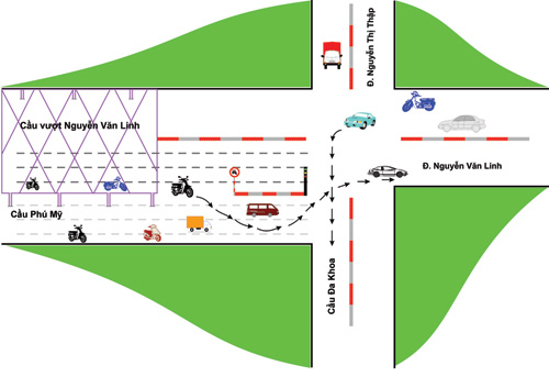 Sơ đồ hướng xe di chuyển qua giao lộ Nguyễn Văn Linh – Nguyễn Thị Thập (Ảnh: Lê Nga)