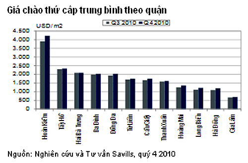 Trong quý IV/2010, quy mô nghiên cứu của thị trường biệt thự, nhà liền kề Hà Nội được chia thành 2 vùng: Vùng 1 gồm 9 quận cũ của Hà Nội, vùng 2 gồm 5 quận mới mở rộng. Tổng cộng có khoảng 12.300 biệt thự và 15.500 nhà liền kề từ 86 dự án. Vùng 2 chiếm 60% tổng lượng cung của thị trường thứ cấp. Quận Hà Đông vẫn giữ vị trí đứng đầu về nguồn cung thứ cấp với 8.300 biệt thự, nhà liền kề, tương ứng với 35% tổng lượng cung của thị trường Hà Nội.