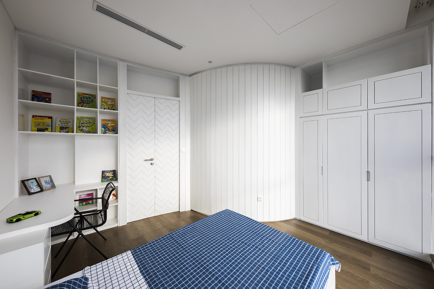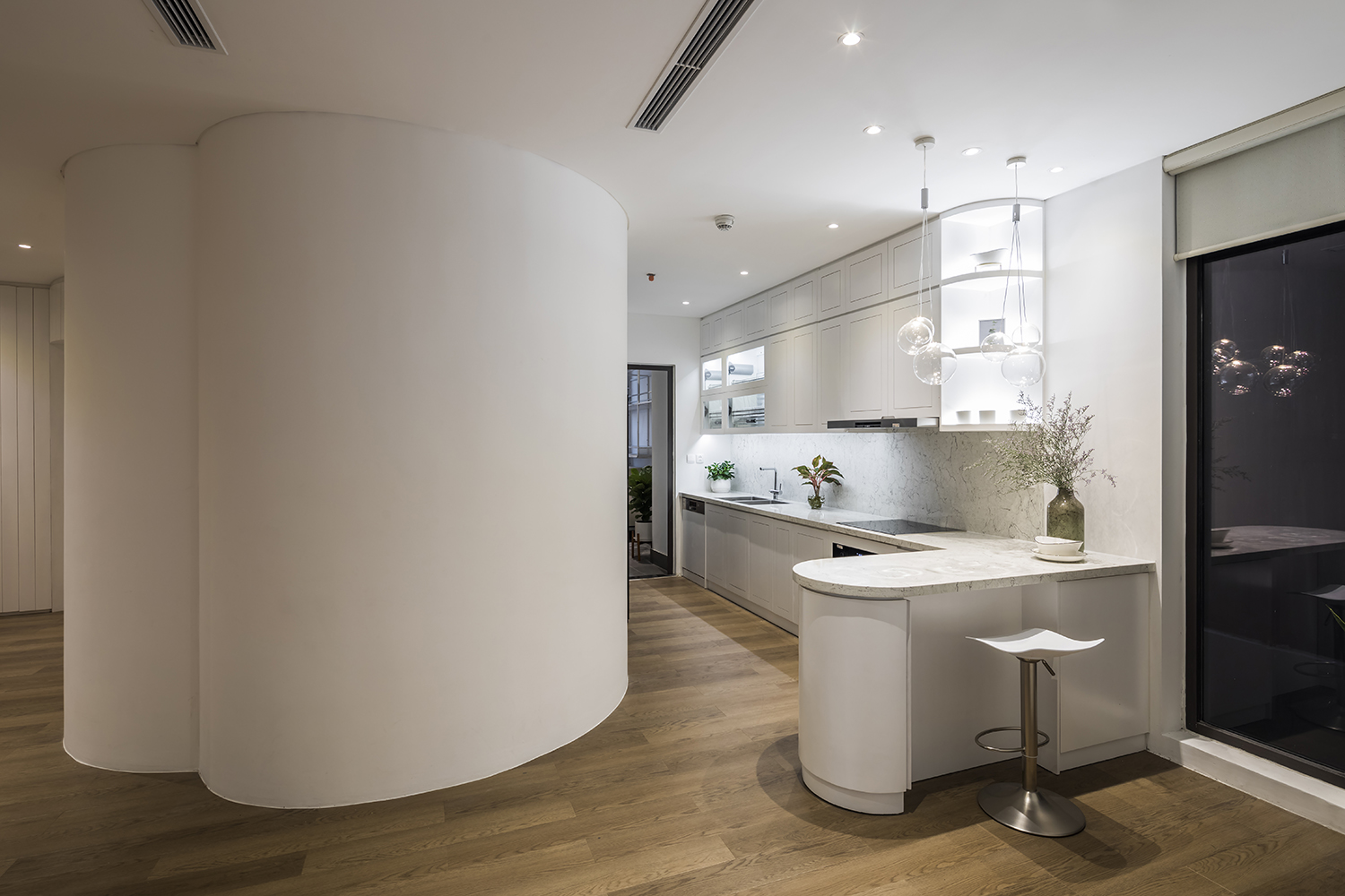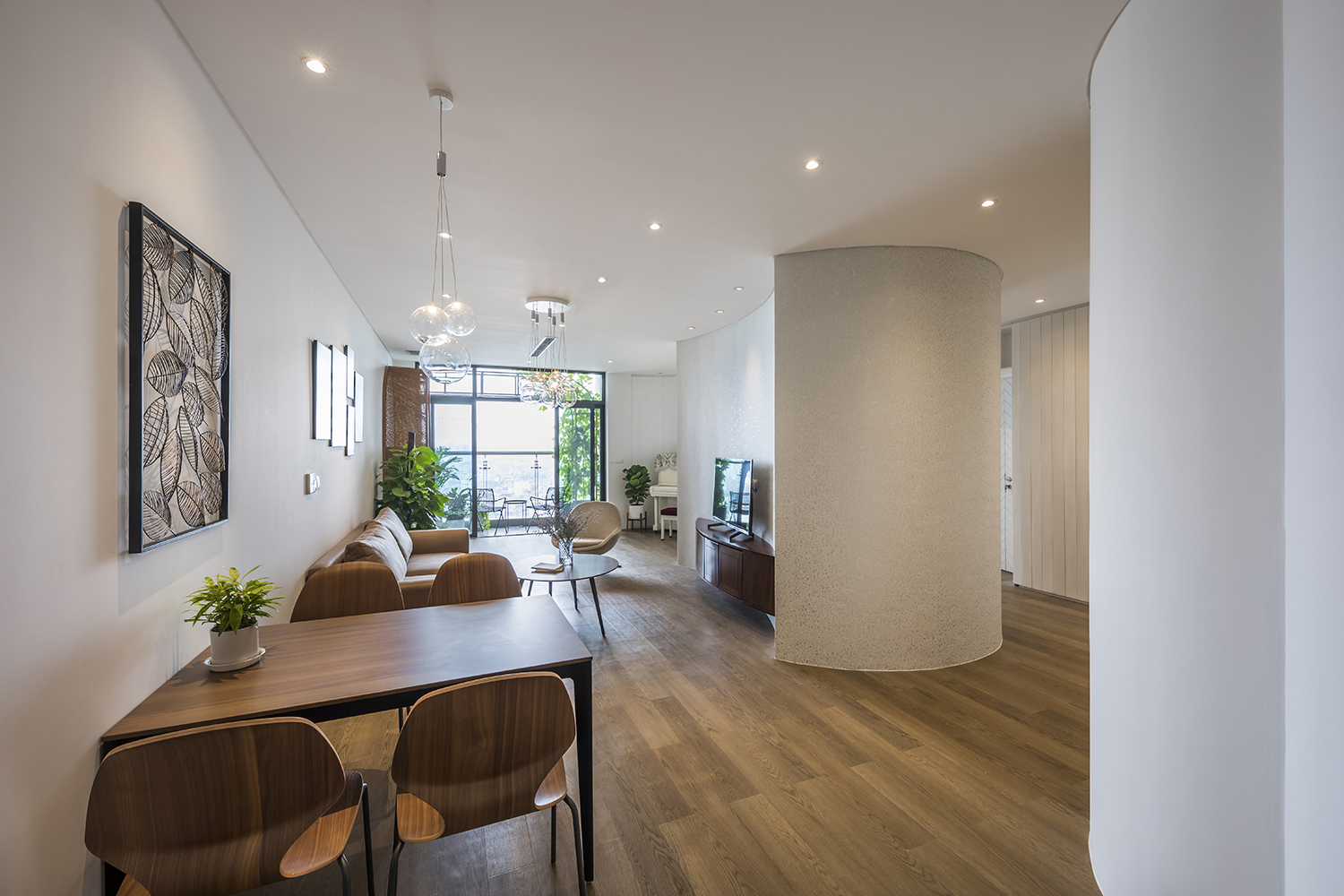 Hệ tủ công năng cong, các cửa sổ được thiết kế không chỉ để đáp ứng các công năng sử dụng mà còn giúp cho sự thông gió và chiếu sáng tư nhiên được tốt hơn. Chủ nhà đã có những phản hồi tích cực và hài lòng về không gian sống mới của gia đình sau khi chuyển tới sống. Thông qua dự án này, chúng tôi muốn mang lại một giải pháp chú trọng vào sự kết nối của các không gian, các thành viên trong gia đình với tự nhiên – một yếu tố quan trọng nhưng thường bị bỏ quên trong những thiết kế hiện tại.
