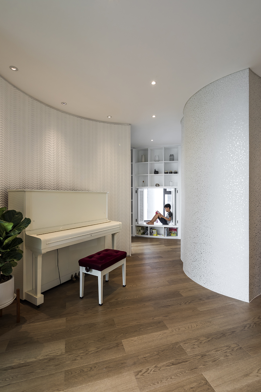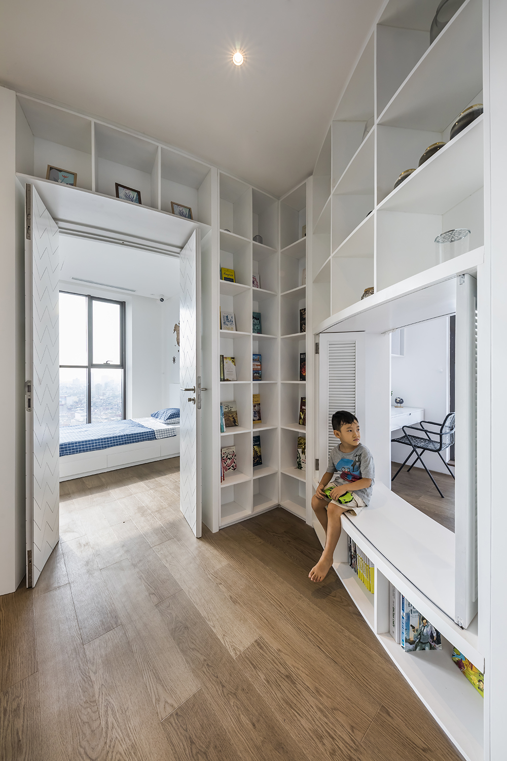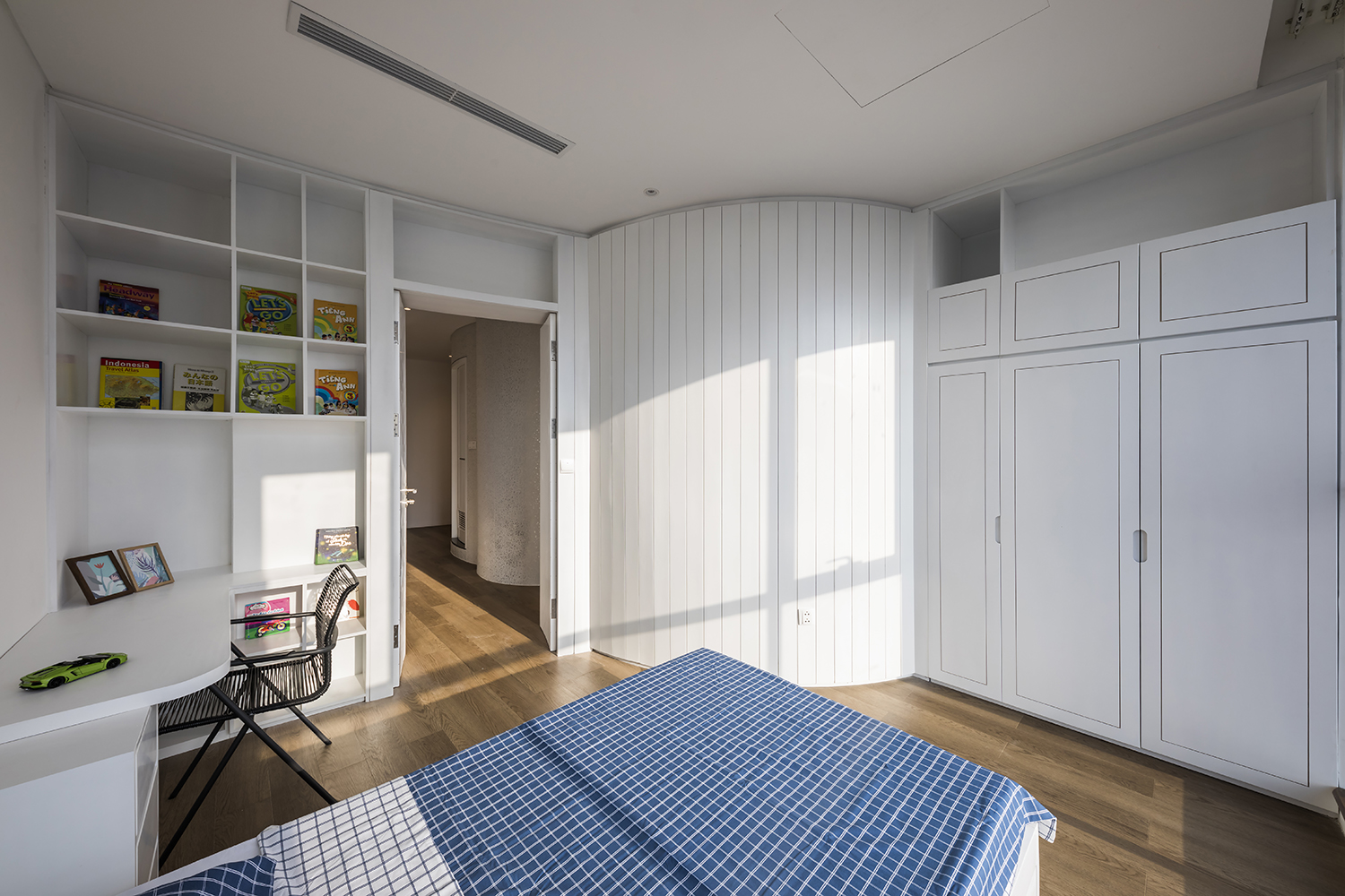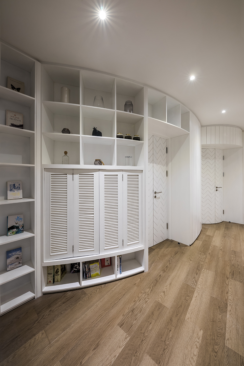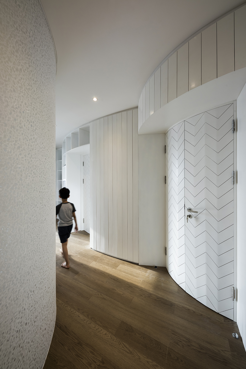 Hành lang chung được tạo bởi hệ tủ ngăn cong mềm mại. Chúng được thiết kế để đáp ứng đồng thời các nhu cầu về công năng nội thất cũng như ngăn chia phòng. Đường cong làm cho không gian đa dạng và thú vị với trẻ em. Một cửa sổ nhỏ được bố trí ở phòng ngủ con gái có thể mở ra để kết nối với không gian chung hoặc đóng lại khi muốn có sự riêng tư cần thiết, từ đó các hoạt động của các thành viên trong gia đình có thể được quan sát lẫn nhau. Hành lang kết nối cho phép những đứa trẻ có thể chạy, nhảy, vui chơi, đọc sách, … cho phép chúng di chuyển trong đó một cách tự do giữa bên trong và bên ngoài các phòng ngủ. Các bức tường và hệ tủ cong được sơn màu trắng để làm cho không gian nhẹ nhàng, tươi sáng và gần gũi với lũ trẻ hơn.
