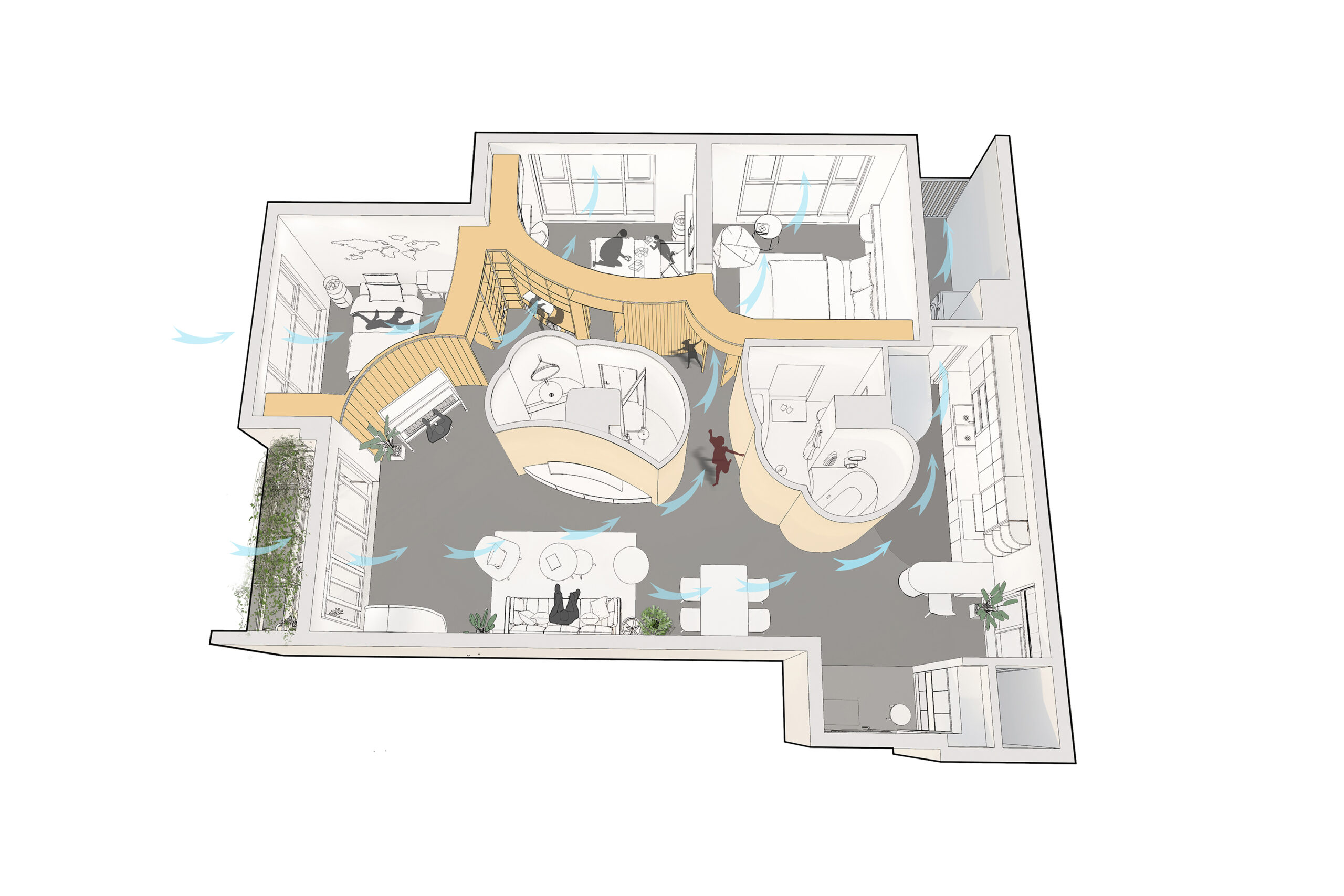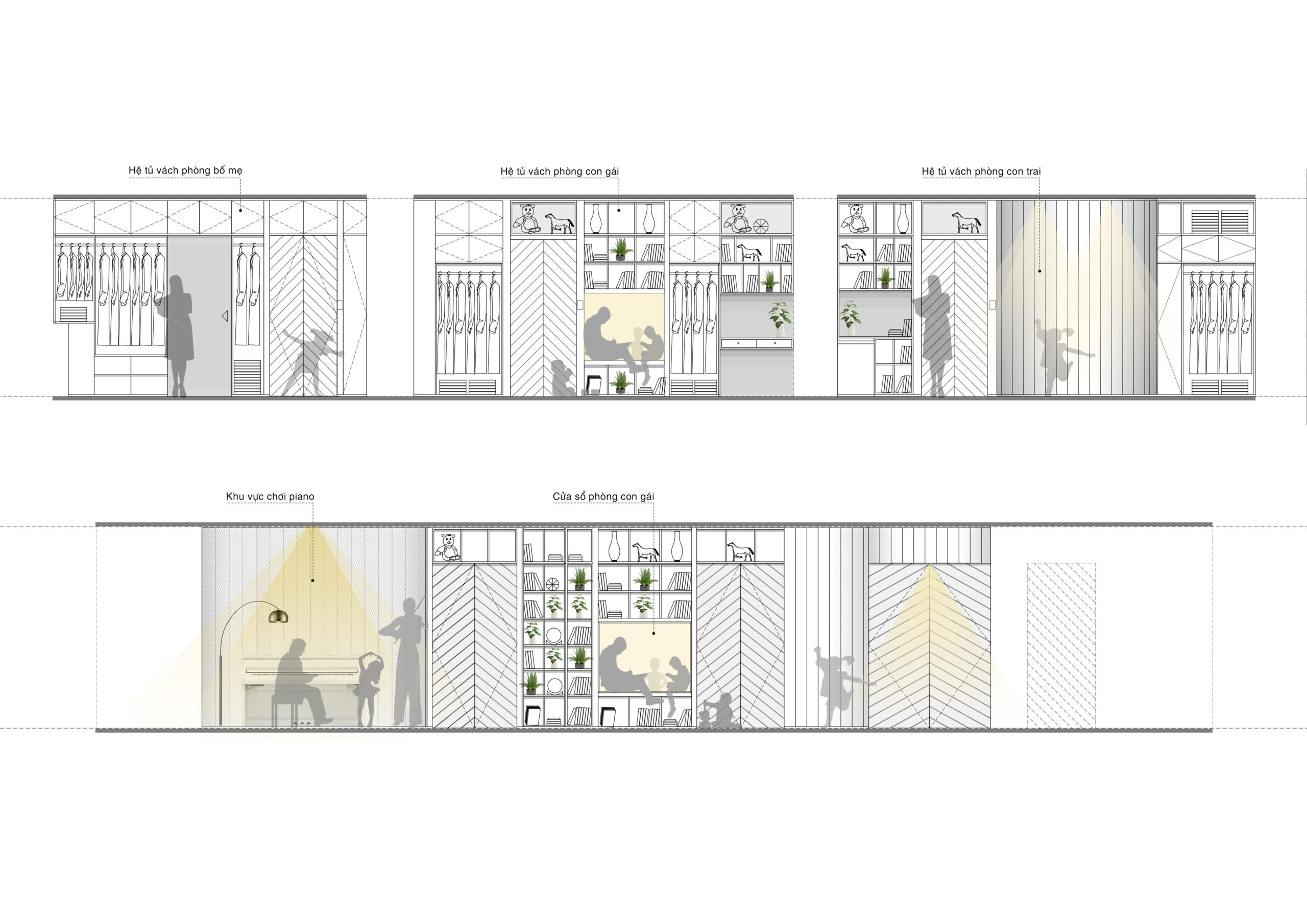 – Tối ưu hóa công năng sử dụng trong căn hộ bằng cách điều chỉnh lại mặt bằng công năng, các tường ngăn phòng sử dụng tủ và đồ nội thất để ngăn chia không gian với mục tiêu đáp ứng được những nhu cầu cơ bản nhất của gia đình. Các tủ nội thất này được nghiên cứu thiết kế phản ánh các nhu cầu sử dụng cơ bản nhưng đa dạng trong nhà ở.