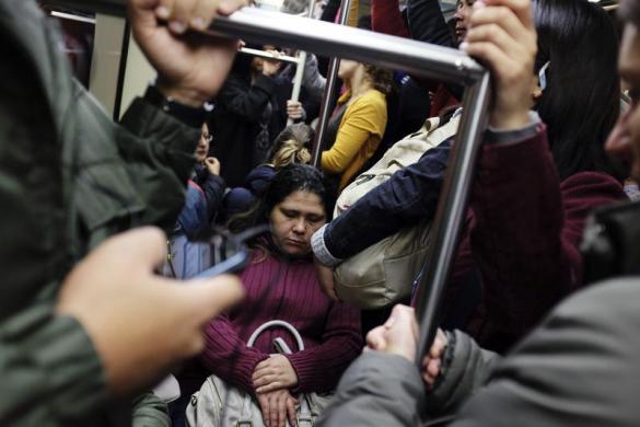 Hành khách chen chúc trên tàu điện ngầm trong giờ cao điểm ở trung tâm thành phố Sao Paulo, hôm 29/5/2013.