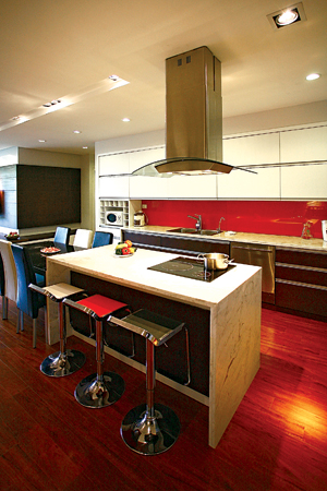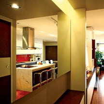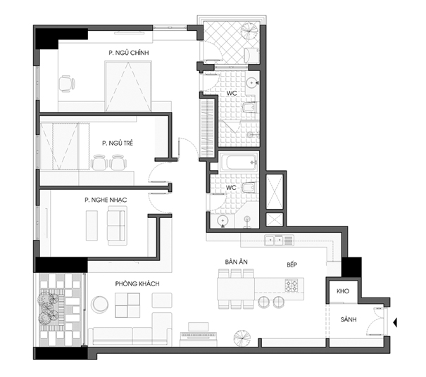 Phòng sinh hoạt chung nằm sát về ban công nhằm lấy ánh sáng tự nhiên và có điểm nhìn thuận lợi cho toàn căn hộ. Góc tường vuông của phòng phía trong được đẩy lùi lại (cùng với việc thu nhỏ nhà vệ sinh ngoài) để nới rộng phòng sinh hoạt chung và phá thế “hun hút” của hành lang phòng ngủ. Góc tường mới này kết hợp với kệ tivi chạy phía dưới đã làm đẹp không gian hơn rất nhiều. Khu vực bếp – ăn nằm phía ngoài, liên thông không ngăn cách với phòng sinh hoạt chung. Một điểm khá thú vị là vì lý do phong thuỷ, nên bếp nấu đặt ở hệ thống tủ bếp sát tường không được hướng. Kiến trúc sư đã làm một đảo bếp kiêm bar giữa phòng, sát bàn ăn.