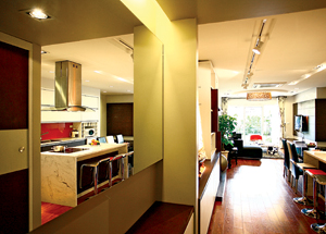 Một chiếc gương ở sảnh như “nhân đôi” không gian / Không gian liên thông nhìn từ bếp về phía phòng sinh hoạt chung
