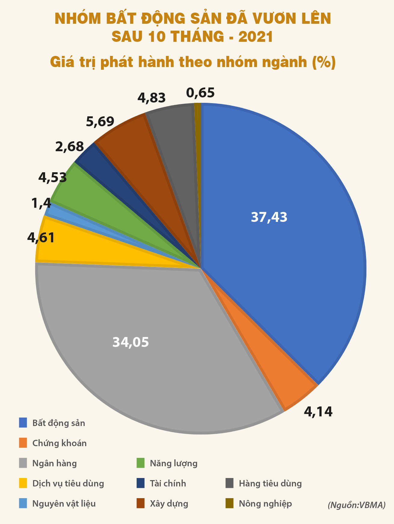 Đáng lưu ý là với giá trị phát hành lên đến 16.575 tỉ đồng tính riêng trong tháng 10 vừa qua, nhóm bất động sản đã vượt qua ngân hàng để vươn lên vị trí dẫn đầu, với con số phát hành lũy kế 10 tháng là 163.900 tỉ đồng, chiếm tỷ trọng vượt trội 37,4% so với mức 34% của nhóm ngân hàng.