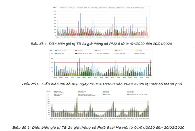 Theo ghi nhận của Tổng cục Môi trường, tại Hà Nội, trong 2 tháng đầu năm 2020, kết quả quan trắc cho thấy có một số khoảng thời gian, giá trị trung bình 24 giờ thông số PM2.5 tăng rất cao (vượt từ 2-3 lần giới hạn cho phép tại Quy chuẩn Việt Nam), như các ngày 1/1, 13/1, 14/1, 2/2 và 20/2.