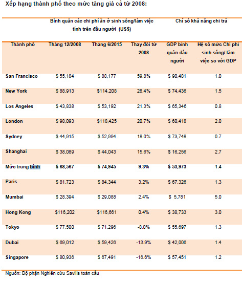 Chi phí bình quân đầu người ở 12 thành phố trong nghiên cứu của Savills là 74,945USD/năm, cao gấp 1.4 lần GDP bình quân đầu người so với dân số của từng thành phố. Tỉ lệ của Hong Kong là 3 lần và đang giảm dần, London giữ cân bằng ở mức 2 lần và ở New York là 1.5 lần và đang tăng lên.