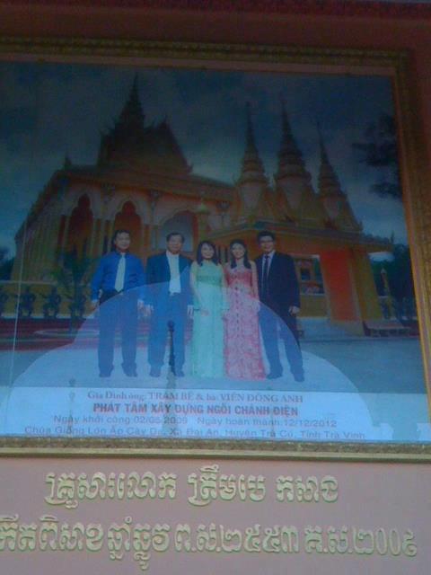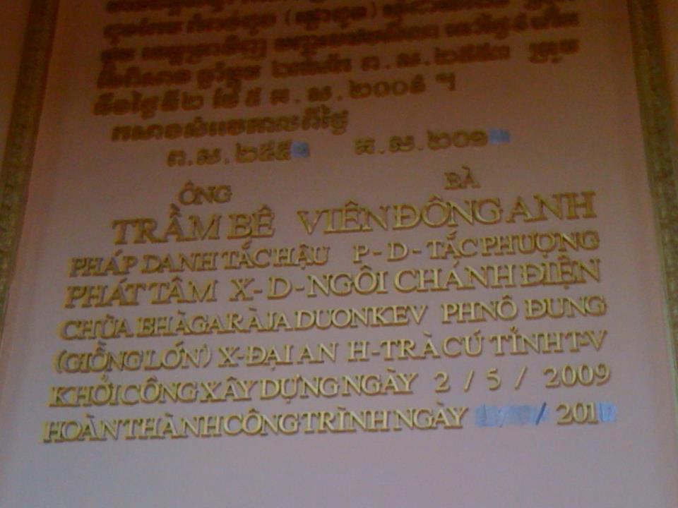 Nhưng điều đáng buồn nhất đó là nơi mặt tiền chính diện chùa, vị trí thường chỉ dành để áp các tranh của Phật để người từ xa trước khi bước vào chùa có thể chiêm bái và lạy Phật, lại là một bức hình thật khổng lồ của gia đình ông Trầm Bê, người đã đóng góp tiền của để xây chùa. Mặt hậu chùa lại là một tấm biển cũng khổng lồ không kém ghi công gia đình ông Trầm Bê đã phát tâm xây dựng chùa với một cách viết tắt cực kỳ cẩu thả… Hai bên hông chùa là các bức phù điêu hình bán nguyệt với hình chân dung của … không phải là các ông lục tiền bối đã có công xây đắp và gìn giữ chùa trong hơn 300 năm qua… mà là chân dung của những người có họ Trầm… Chúng tôi đã nhìn nhau mà hỏi” Đây có còn là ngôi Chùa Cò của ấp Giồng Lớn, xã Đại An, huyện Trà Cú , tỉnh Trà Vinh, một ngôi chùa nuôi dưỡng cuộc sống tinh thần đạo Phật Tiểu Thừa của đồng bào Khơme và cả người Việt từ mấy trăm năm nay nữa hay không??