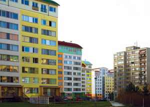 Không chỉ tăng cường về diện tích sử dụng, mà màu sắc đa dạng cũng góp phần thay đổi bộ mặt của khu phố. / Một khu tập thể cho những người có thu nhập thấp mới xây năm 2007 tại Cakovice–Praha.