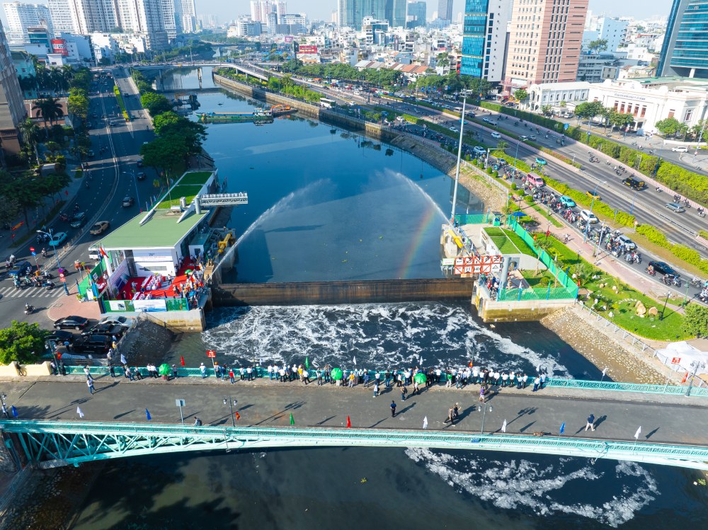 Tại buổi lễ, chủ đầu tư đã vận hành thử nghiệm cống ngầm Bến Nghé, mô phỏng hoạt động cống ngăn triều và bơm thoát nước khi có nguy cơ ngập.
