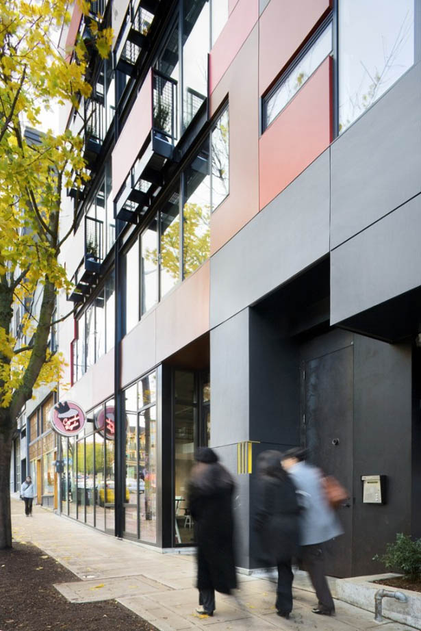 Một vài điểm mốc của sự tương quan giữa công trình và hình thái đô thị, và phong cảnh nền công nghiệp và chế tạo ôtô đã định hình nên công trình với các cửa sổ rộng và các trần cao, việc sử dụng thép ngay tại lối vào, và mặt dựng với các tấm ghép với một dải màu sắc được lấy cảm hứng từ những mẫu xe cổ điển của thập niên 1920. Mỗi căn hộ được thiết kế với trần nhà cao 2,8 mét từ sàn đến trần, và những sắp xếp mặt bằng mở với một khu bếp chỉ kín một phần. Các tấm vách di động giống như những cánh cửa trò chơi xếp hình được kéo theo trần nhà, cho phép những chủ sở hữu tự điều chỉnh các không gian sinh sống của họ theo yêu cầu.