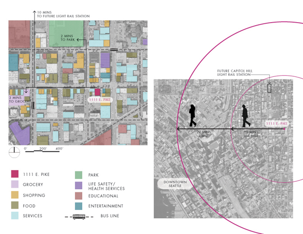 Công trình 1111 E.Pike là một ví dụ hoàn hảo cho một không gian sinh sống không mắc ngay tại trung tâm đô thị nhộn nhịp. Công trình đã được thị trường thẩm định và đáp ứng được các yêu cầu của tiêu chuẩn LEED cho các hạng mục bao gồm Mật độ xây dựng, Lựa chọn khu đất, Thay thế phương tiện giao thông, và Quản lý nước mưa xối.
