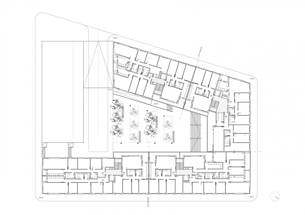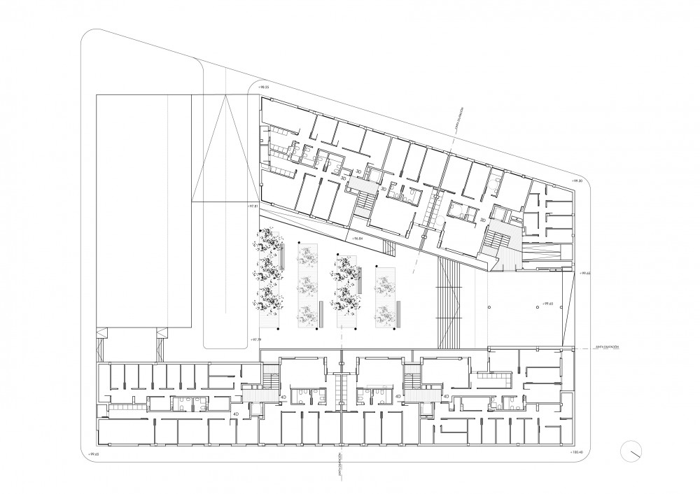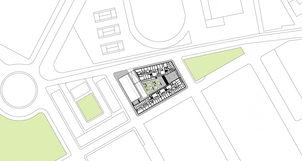 Với mục đích giải quyết đặc điểm đô thị của không gian bên trong của các cụm công trình thành phố, hai giới hạn được đặt ra: đầu tiên là làm cho vừa khu đỗ xe của tầng bán tầng hầm với bề rộng ngang bằng các tầng khác, không cho phép bố trí mật độ cao nhất để không phải giảm kích thước của không gian công cộng; thứ hai là giải phóng cái cổng lớn tại phía bắc, bên dưới tòa nhà, vốn kết nối không gian bên trong với không gian cây xanh hiện hữu trước đây. Không gian mở này cùng với các không gian mở khác tại phía tây và phía nam của khu đất, cùng với cây xanh và ghế ngoài trời đã giúp cho khu vực sân bên trong trở thành một không gian cộng đồng.