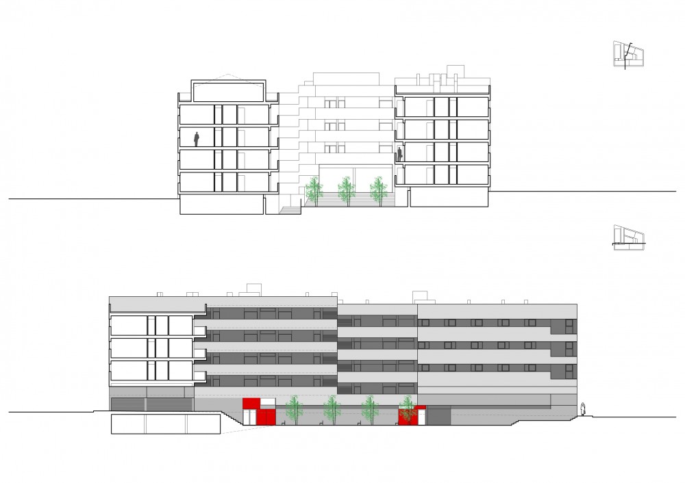 Dự án cũng đồng thời thể hiện việc tham khảo địa thế của khu đất, với một con dốc quan trọng hiện nằm giữa điểm đầu và điểm cuối của khối công trình, và với những giới hạn về công năng cũng như tính khả thi kinh tế, vốn là những điều bình thường của thể loại phát triển nhà ở này. Các yếu tố quyết định của dự án -tính kinh tế thể hiện trong việc lựa chọn vật liệu và sự thích nghi với con dốc – được truyền tải vào công trình bằng một ngôn ngữ ẩn dụ dựa vào các dải ngang đen và trắng. Tổ hợp này, vốn xắp xếp và kết nối các ô cửa sổ của các căn hộ dân cư, mang lại một sự năng động nhất định cho hình khối của công trình. Chi tiết giữa tòa nhà và sàn được giải quyết bằng các tấm đá vôi trắng.