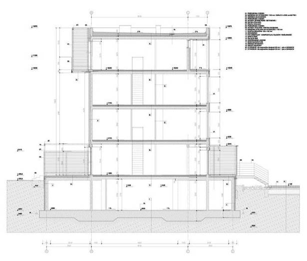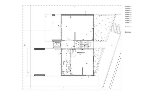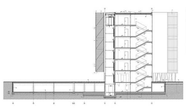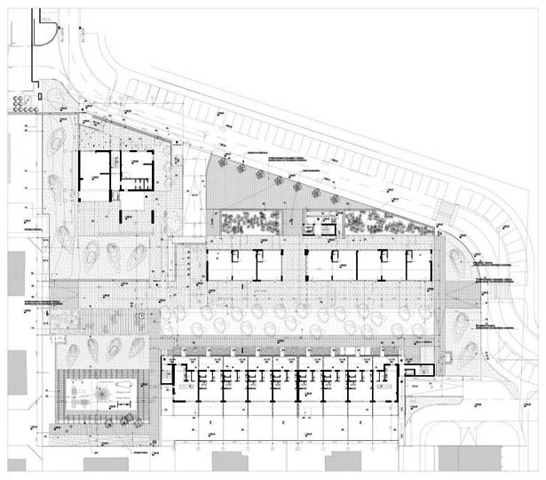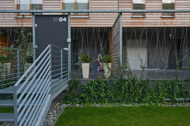 Công trình có hai khối dân cư. Khối phía dưới với các lối vào riêng biệt phía bên hành lang giao thông và vườn cây xanh tại phía nam được che chắn bởi các căn hộ chung cư cao 2 tầng. Khối chung cư này có bố trí lối vào từ hành lang tại hướng bắc. Các không gian thường được sử dụng trong ngày thì được bố trí ngay tại tầng có lối vào trong khi các không gian tiện ích khác thì nằm tại tầng phía dưới.