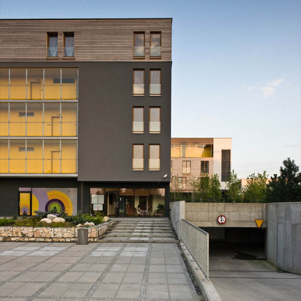 Công trình có hai khối dân cư. Khối phía dưới với các lối vào riêng biệt phía bên hành lang giao thông và vườn cây xanh tại phía nam được che chắn bởi các căn hộ chung cư cao 2 tầng. Khối chung cư này có bố trí lối vào từ hành lang tại hướng bắc. Các không gian thường được sử dụng trong ngày thì được bố trí ngay tại tầng có lối vào trong khi các không gian tiện ích khác thì nằm tại tầng phía dưới.