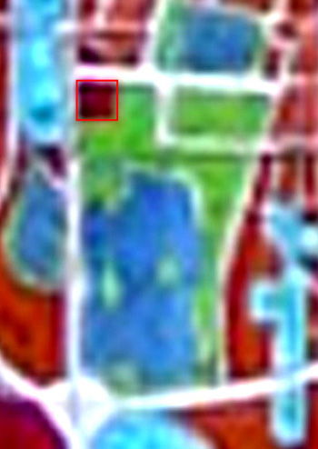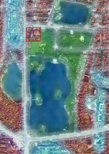 Chồng lớp bản đồ QH 2001, trích phần Công viên so sánh vị trí vùng tô mầu đỏ công trình công cộng chỉ khoanh vào khu vực rạp Xiếc với ảnh chụp vệ tinh công viên (chụp khoảng 2006).