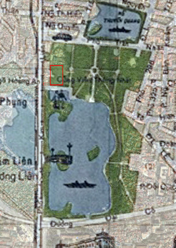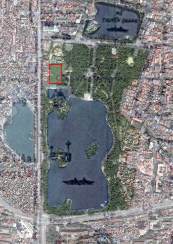Bằng kỹ thuật đồ hoạ hiện đại và chính xác, chúng tôi chồng lớp so sánh bản đồ vệ tinh với bản đồ năm 1962, để thấy khu khách sạn Novotel Ha Noi on the Park đang xây dựng nằm ở vị trí nào trong bản đồ công viên xưa.