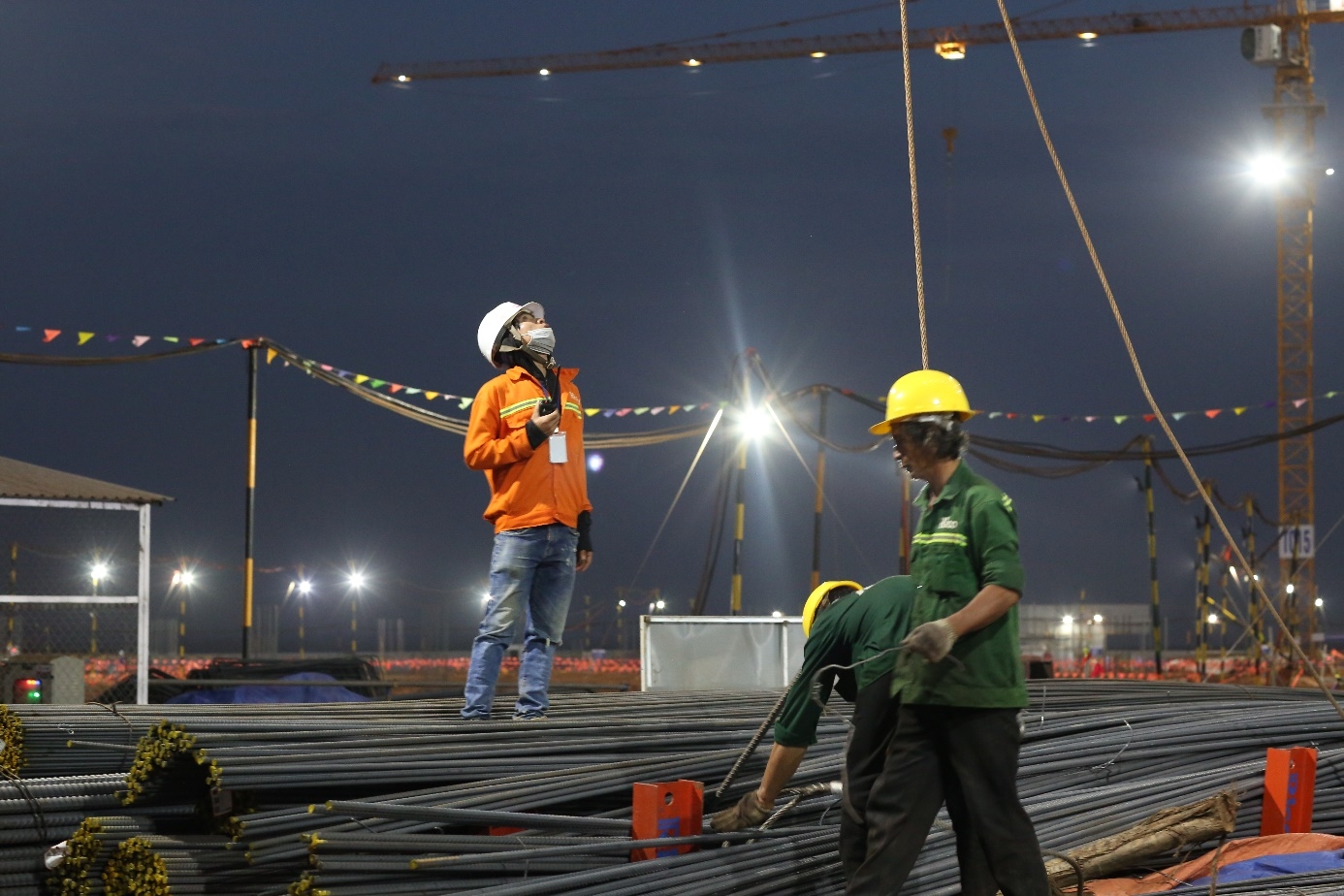 Công nhân thi công vào buổi đêm (đến 23h) để đảm bảo tiến độ hạng mục công việc.