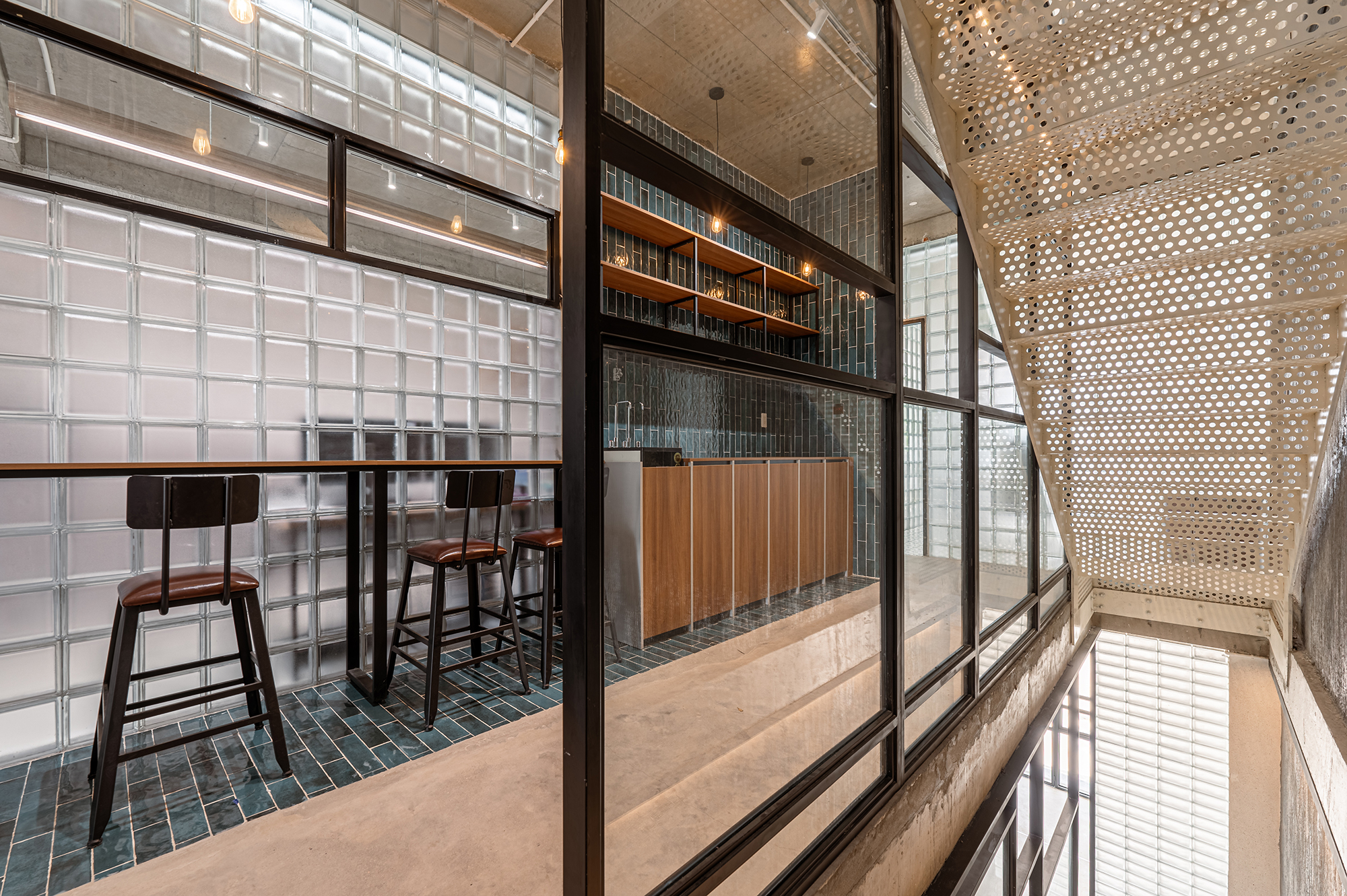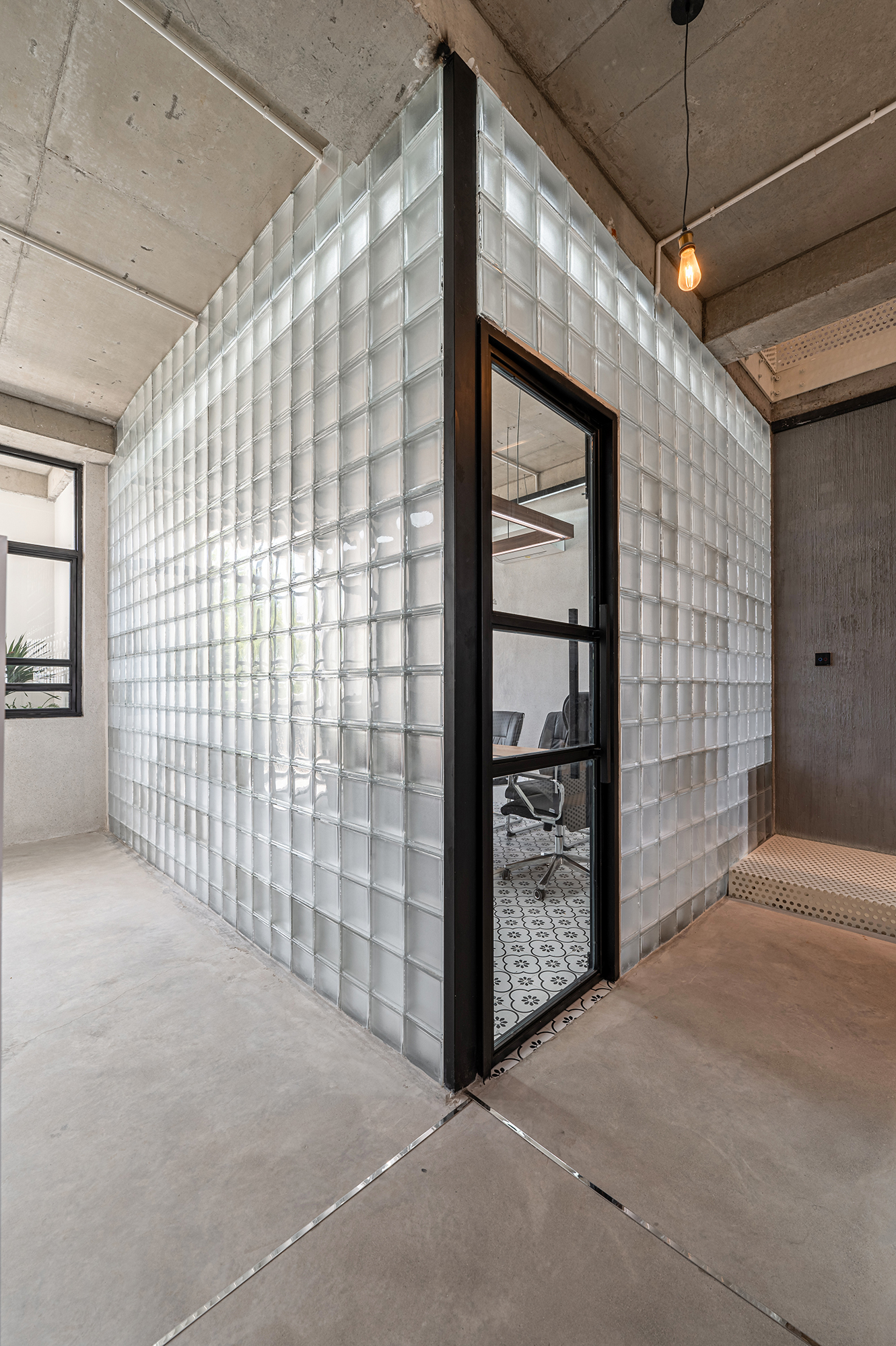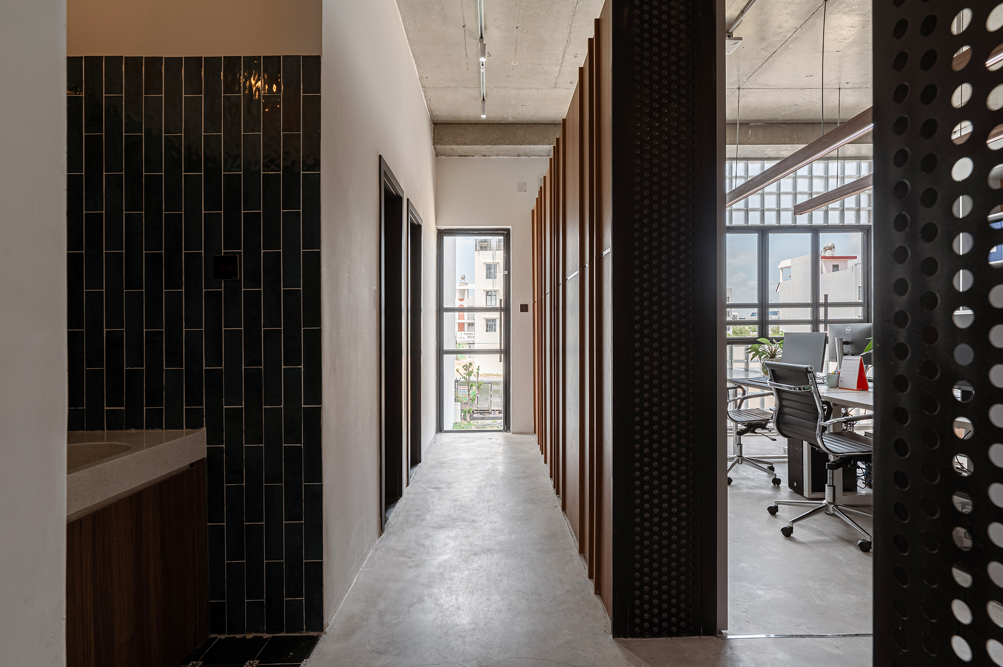 Nội thất đơn giản theo phong cách công nghiệp, phù hợp cho một văn phòng trẻ năng động. Trần bê tông thô, kết hợp những mảng tường thô ráp, cầu thang sắt tấm đục lỗ tạo nên nhiều không gian tươi trẻ năng động kích thích tính sáng tạo cho mọi người. Tường gạch kính cùng với vách kính đan xen trong các không gian làm cho ánh sáng tự nhiên đi xuyên suốt công trình.