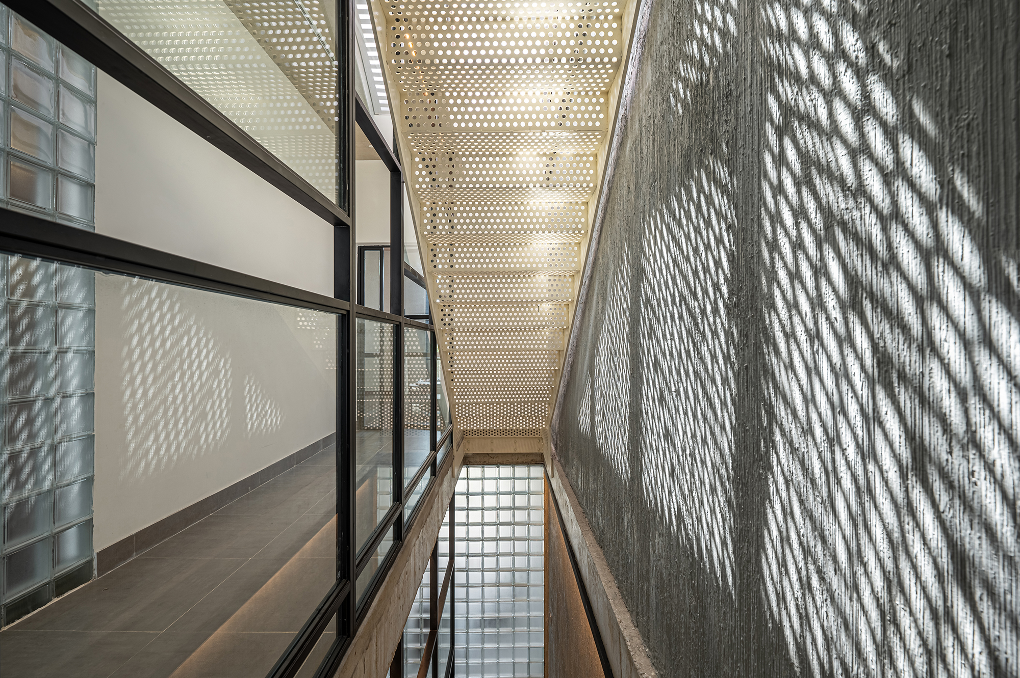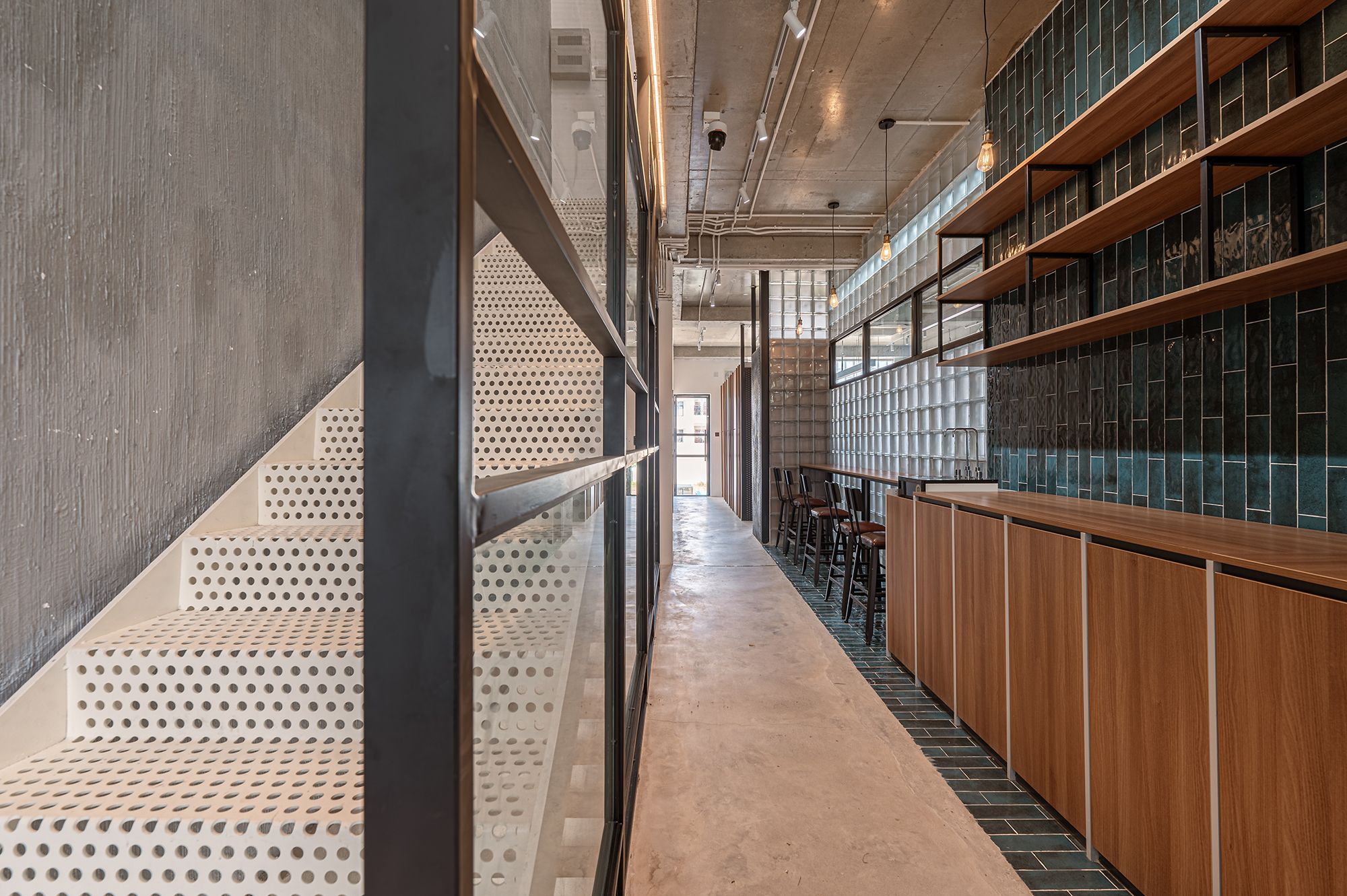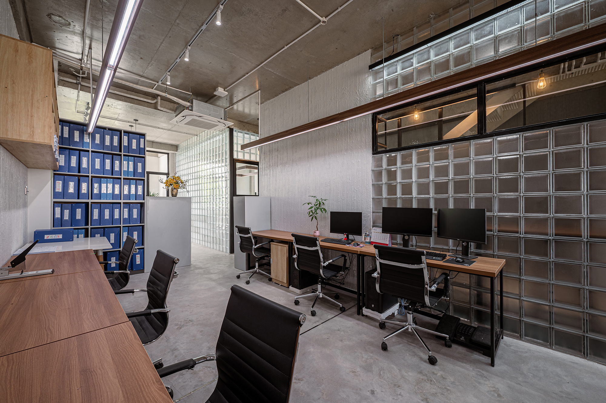 Nội thất đơn giản theo phong cách công nghiệp, phù hợp cho một văn phòng trẻ năng động. Trần bê tông thô, kết hợp những mảng tường thô ráp, cầu thang sắt tấm đục lỗ tạo nên nhiều không gian tươi trẻ năng động kích thích tính sáng tạo cho mọi người. Tường gạch kính cùng với vách kính đan xen trong các không gian làm cho ánh sáng tự nhiên đi xuyên suốt công trình.