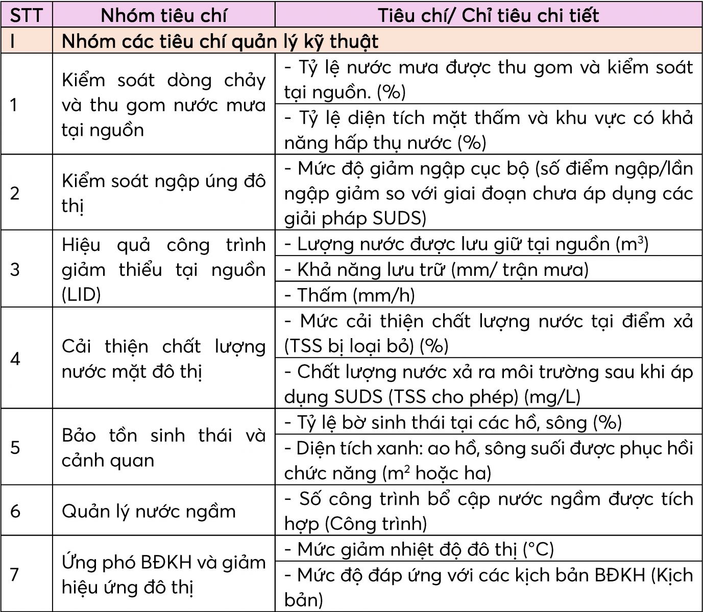 Bộ tiêu chí và chỉ tiêu đề xuất được xây dựng trên cơ sở các nguyên tắc và yêu cầu đã xác lập, với cấu trúc bao quát đầy đủ các nội dung kỹ thuật, thể chế, quản lý vận hành và sự tham gia của cộng đồng. Hệ thống này cho phép đánh giá toàn diện hiệu quả quản lý thoát nước mặt theo định hướng Thành phố bọt biển, đồng thời cung cấp cơ sở để lựa chọn giải pháp, theo dõi tiến độ và điều chỉnh chính sách phù hợp với điều kiện cụ thể của từng đô thị. Đây là nền tảng quan trọng nhằm thúc đẩy quá trình chuyển đổi sang mô hình quản lý thoát nước bền vững tại Việt Nam.