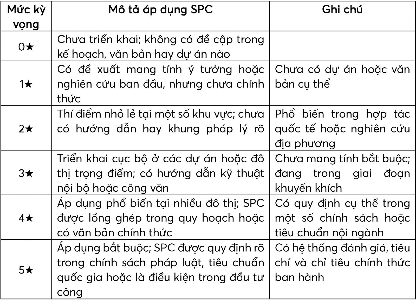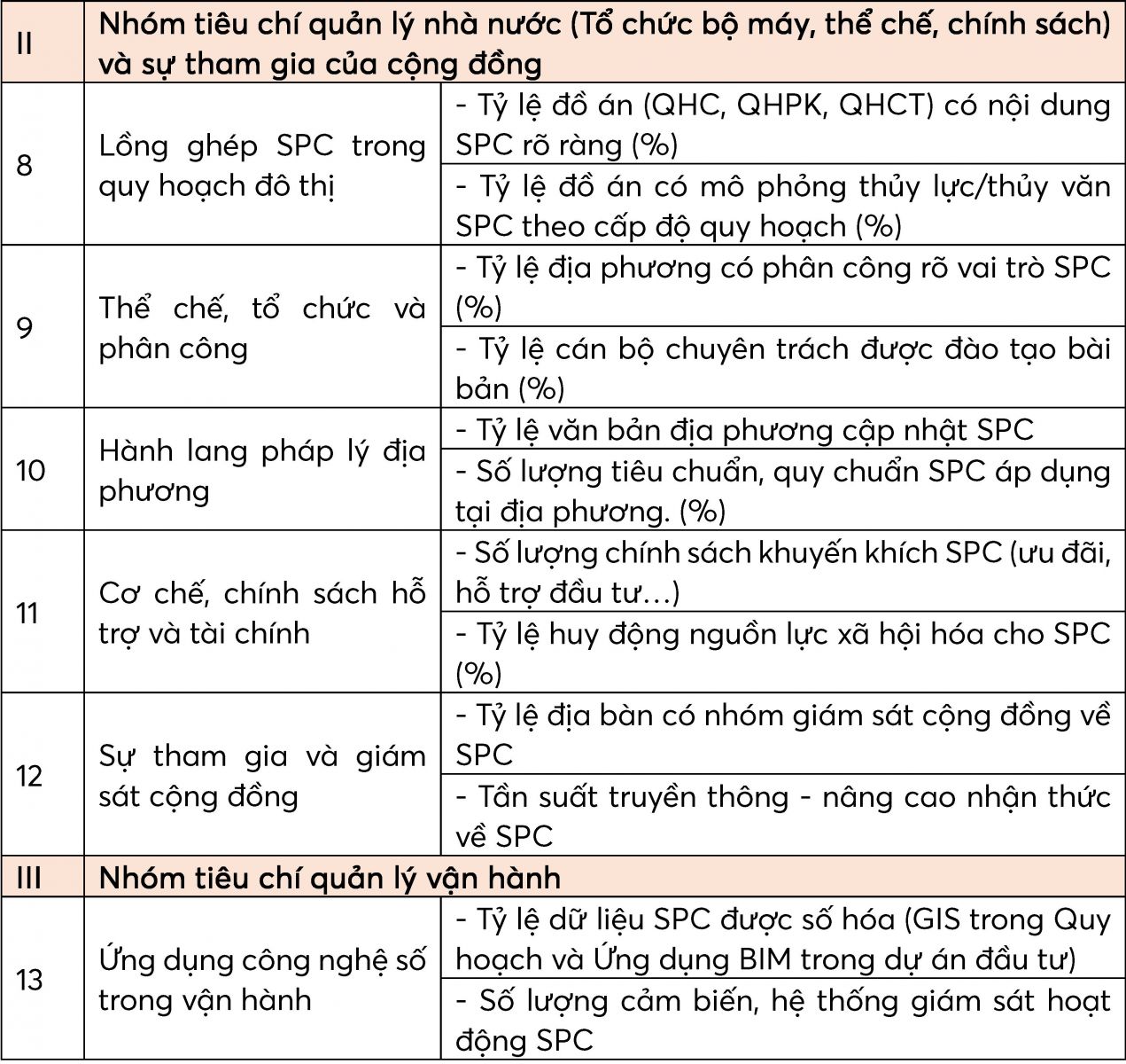 Mỗi tiêu chí gắn với một hoặc một số chỉ tiêu định tính và định lượng, phù hợp với từng giai đoạn quy hoạch, đầu tư và vận hành. Hệ thống này không chỉ phản ánh mức độ đáp ứng mục tiêu quản lý SPC, mà còn cung cấp cơ sở theo dõi tiến độ, đo lường hiệu quả và hỗ trợ điều chỉnh chính sách phù hợp với điều kiện cụ thể của từng đô thị.