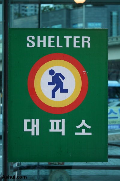 Cách khách sạn Westin Chosun ở Seoul vài bước chân có một quán càphê Starbucks. Ở đó, tôi chợt chú ý đến một tấm biển màu đỏ gắn ở vừa tầm mắt người lớn, trên cửa ra vào. Biển đề chữ “shelter” (nơi trú ẩn). Trí tò mò của tôi bắt đầu bị khơi dậy khi thấy tấm biển tương tự ở cách Westin Chosun khoảng 300m, ngay lối vào ga Euljiro-1.