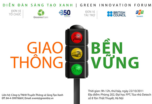 Ngày 22/10, Diễn đàn Sáng Tạo Xanh – Giao thông bền vững diễn ra tại Đại học FPT (Hà Nội), là sự kiện thứ ba trong khuôn khổ Diễn đàn Sáng tạo Xanh 2011. Chương trình đề cập đến các vấn đề tồn tại trong giao thông đô thị hiện nay đồng thời bàn luận một số giải pháp khả thi cho việc phát triển giao thông bền vững cho các đô thị lớn ở Việt Nam. Chương trình được tổ chức bởi Công ty TNHH Truyền thông và Sáng tạo Xanh (GreennoCom) và Câu lạc bộ 350Vietnam với sự hỗ trợ của Hội đồng Anh Việt Nam và Viện Nghiên cứu Công nghệ FPT.