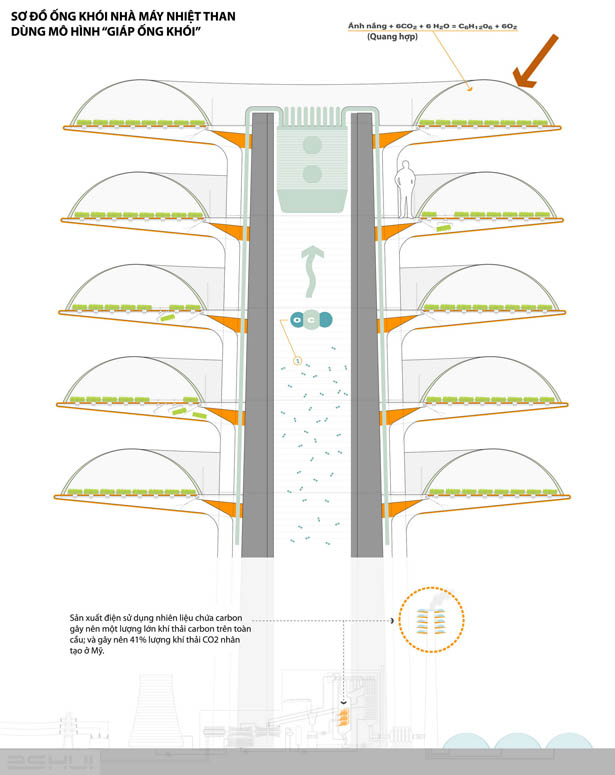 Nhìn kĩ vào những mặt cắt, ta nhận ra 2 trụ xoay của 2 cầu nổi còn đóng vai trò là nơi thông khí trời cho đường hầm và cũng nơi tập trung các đường ống thu khí CO2. Còn ngay dưới những con đường dạo và vườn cây là những khoang trữ khí CO2 khổng lồ (khoảng hơn 200.000m3 khí). Từ các khoang chứa này, khí CO2 sẽ được phân phối đến các khoang kính nuôi tảo. Tại đây, cùng với ánh sáng mặt trời tập trung qua vòm kính, quá trình quang hợp diễn ra. Khi tảo có thức ăn của chúng (CO2), chúng giả cho chúng ta khí oxy (O2).