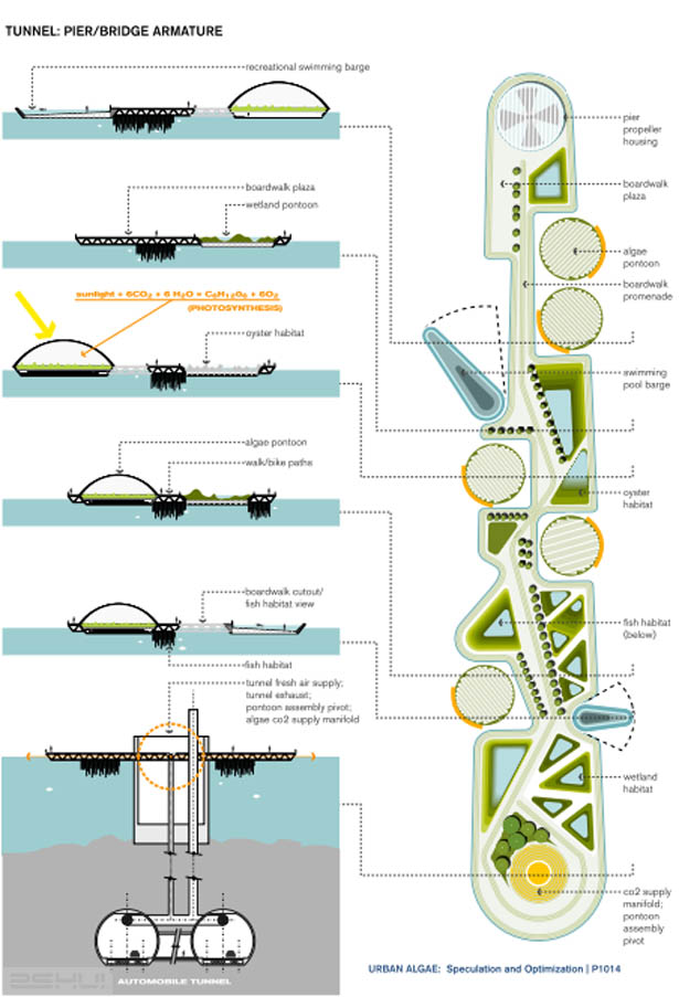 5/. Nhiều nguồn khí CO2 tập trung được đặt gần mặt nước, cho phép các khoang chứa CO2 có chức năng như những cầu tàu hay phần mở rộng ra mặt nước. Khi đó, những cầu tàu nuôi tảo này sẽ là một loại thức không gian mở/công cộng mới, vừa tiếp cận mặt nước vừa cung cấp cơ sở hạ tầng theo tiêu chí Xanh.