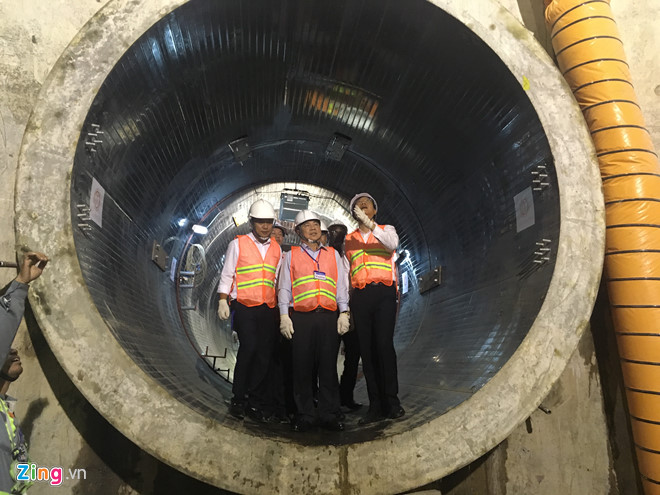Chủ tịch UBND TP.HCM Nguyễn Thành Phòng (giữa) Giám đốc Quốc gia của WB tại Việt Nam, ông Ousmane Dione (phía sau, bên phải) đi bộ kiểm tra đoạn cống D3.200 mm từ Giếng S5 qua S6 đã thi công xong. (Ảnh: Phương Thảo)