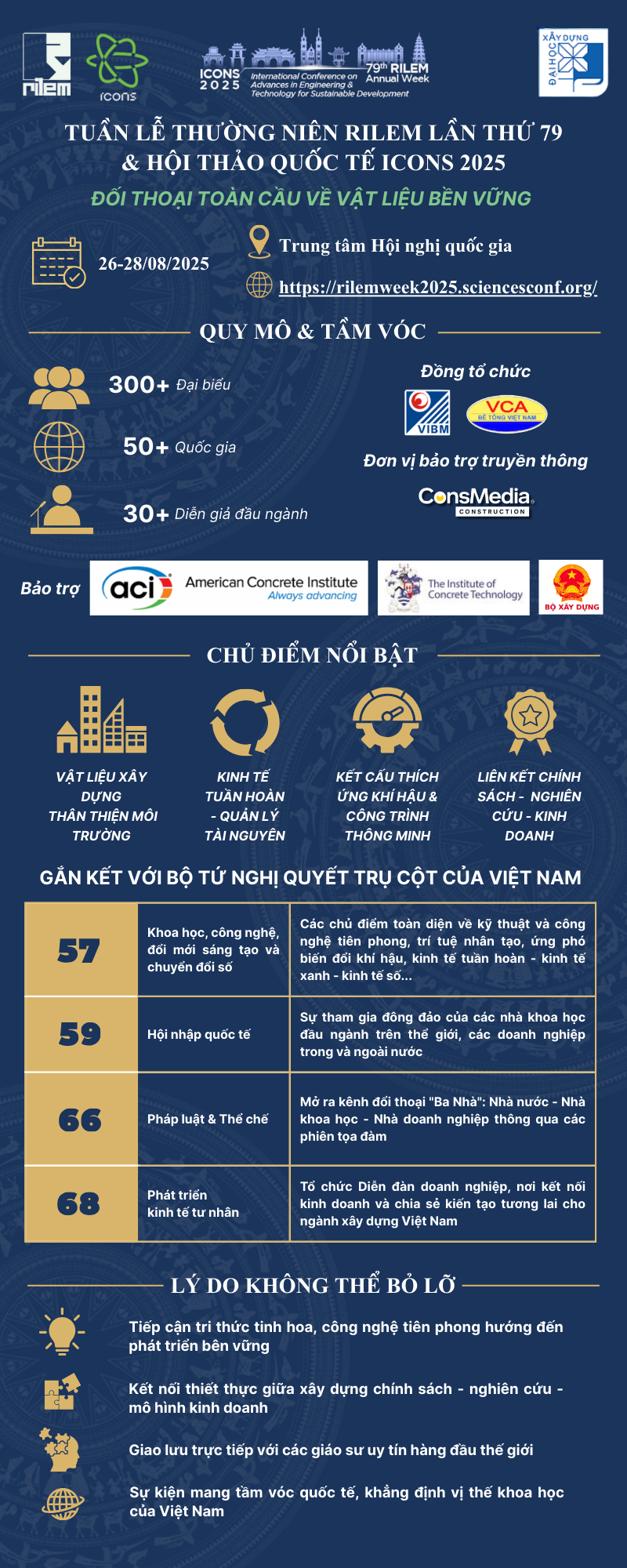 Điểm nổi bật của hội nghị năm nay không chỉ nằm ở giá trị học thuật, mà còn ở sự kết nối giữa nghiên cứu và thực tiễn. Trong bối cảnh Việt Nam đang triển khai nhiều nghị quyết quan trọng của Đảng và Chính phủ về phát triển khoa học – công nghệ, hội nhập quốc tế, cũng như thúc đẩy khu vực kinh tế tư nhân, hội nghị trở thành diễn đàn để các nhà khoa học, doanh nghiệp và cơ quan quản lý cùng gặp gỡ, trao đổi. Các phiên thảo luận chuyên sâu sẽ tập trung vào hai khía cạnh: (1) giải quyết những bài toán thực tiễn từ nhu cầu của doanh nghiệp thông qua nghiên cứu và phát triển công nghệ mới; (2) xây dựng và hoàn thiện chính sách, hệ thống pháp lý, tiêu chuẩn quốc gia hài hòa với quốc tế, qua đó thúc đẩy việc ứng dụng công nghệ vào thực tế. Đặc biệt, sự kiện cũng là cơ hội để Việt Nam học hỏi kinh nghiệm quốc tế, từ đó đề xuất và phát triển hệ thống luật pháp, tiêu chuẩn phù hợp với thực tiễn trong nước, đồng thời đóng góp vào xu hướng phát triển công nghệ và vật liệu xây dựng toàn cầu. Với sự đồng hành, bảo trợ và hỗ trợ của Bộ Xây dựng, các bộ ngành liên quan cùng nhiều tổ chức, doanh nghiệp uy tín, Tuần lễ thường niên RILEM 79th & ICONS 2025 hứa hẹn sẽ là một sự kiện thành công, góp phần khẳng định vị thế của Việt Nam trên bản đồ khoa học công nghệ thế giới.
