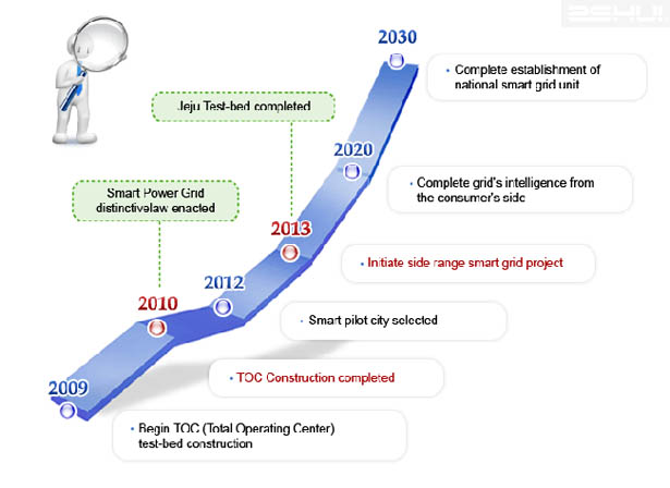Theo như kế hoạch, đến cuối năm 2013 (thời điểm dự án Jeju kết thúc), sẽ có từ 3 đến 4 thành phố lớn ở Hàn Quốc sử dụng hệ thống lưới điện thông minh. Một lý do cho sự tham gia này là Hàn Quốc đã đưa vào luật. Hàn Quốc chỉ đầu tư khoảng 20 triệu USD cho các nghiên cứu về năng lượng sạch của mình, xếp vị trí gần cuối (thứ 19) trong danh sách các nước công nghiệp hóa G20. Vì vậy, bộ luật mới quy định phải chi ít nhất 2% tổng sản phẩm quốc nội cho quá trình nghiên cứu và phát triển các nguồn năng lượng tái tạo mới và đến trước năm 2022, nguồn năng lượng sử dụng trong các công ty phải có ít nhất 10% là từ các nguồn năng lượng mới này.