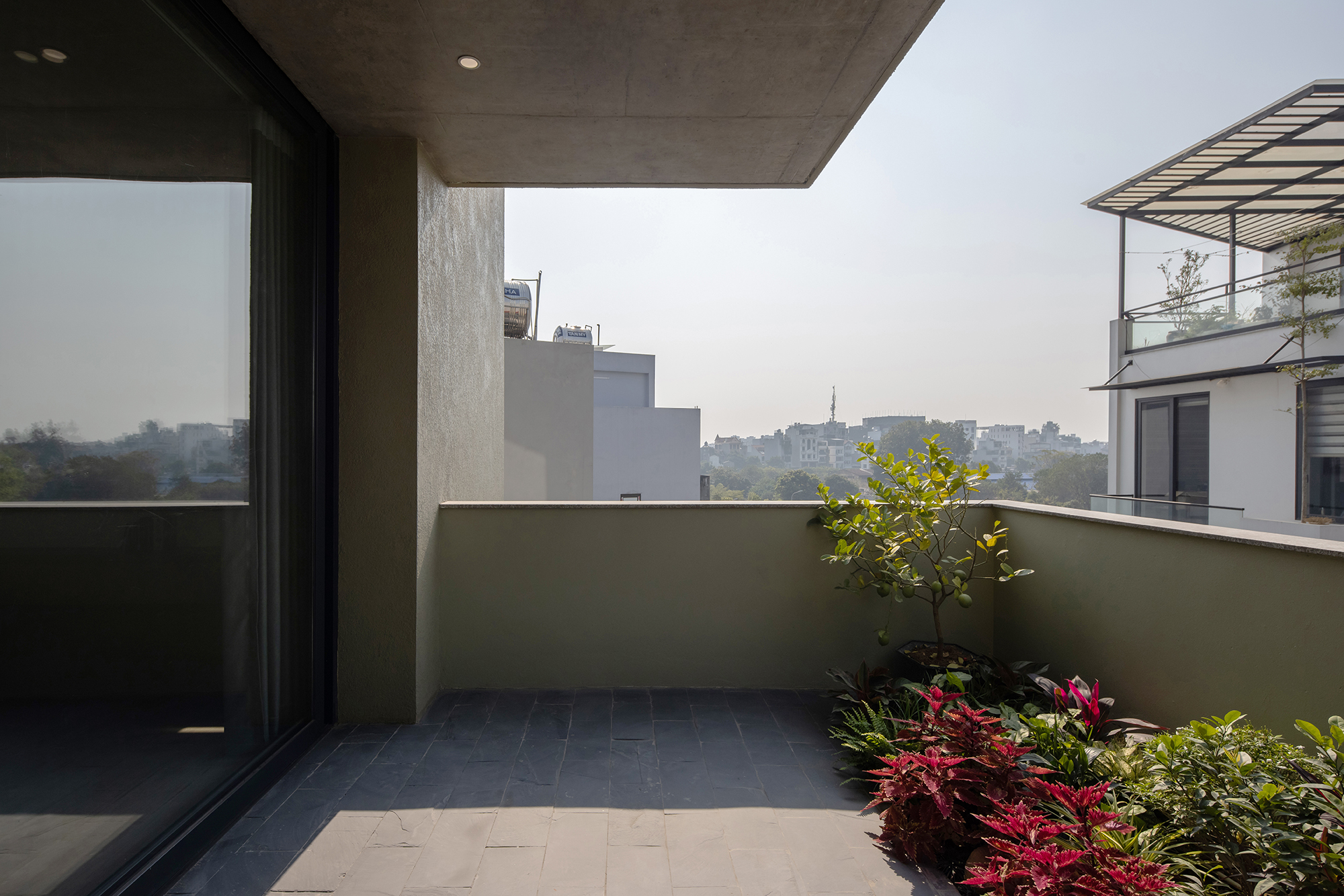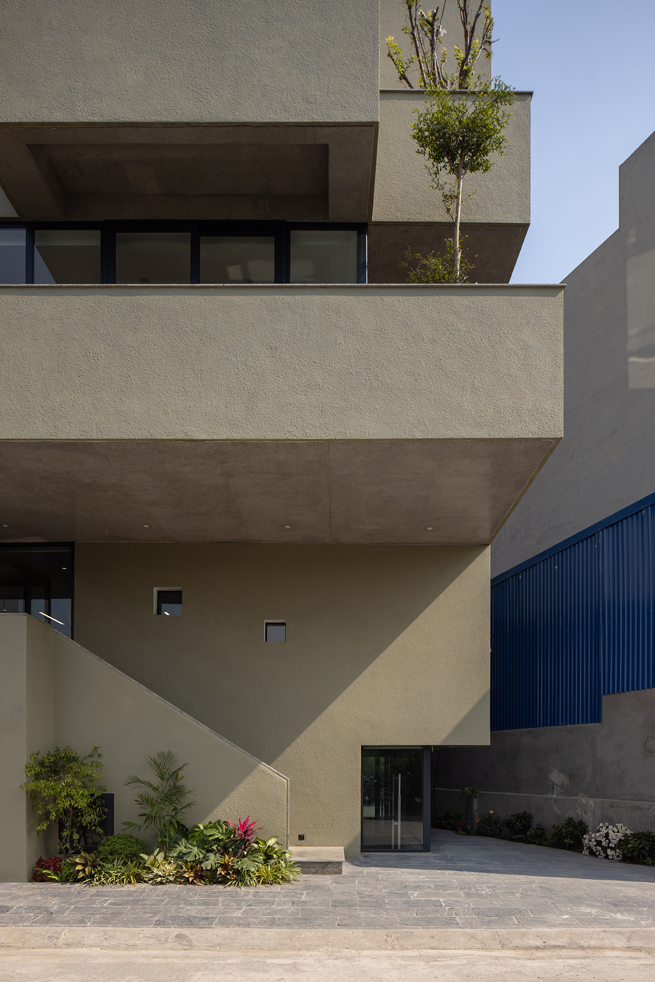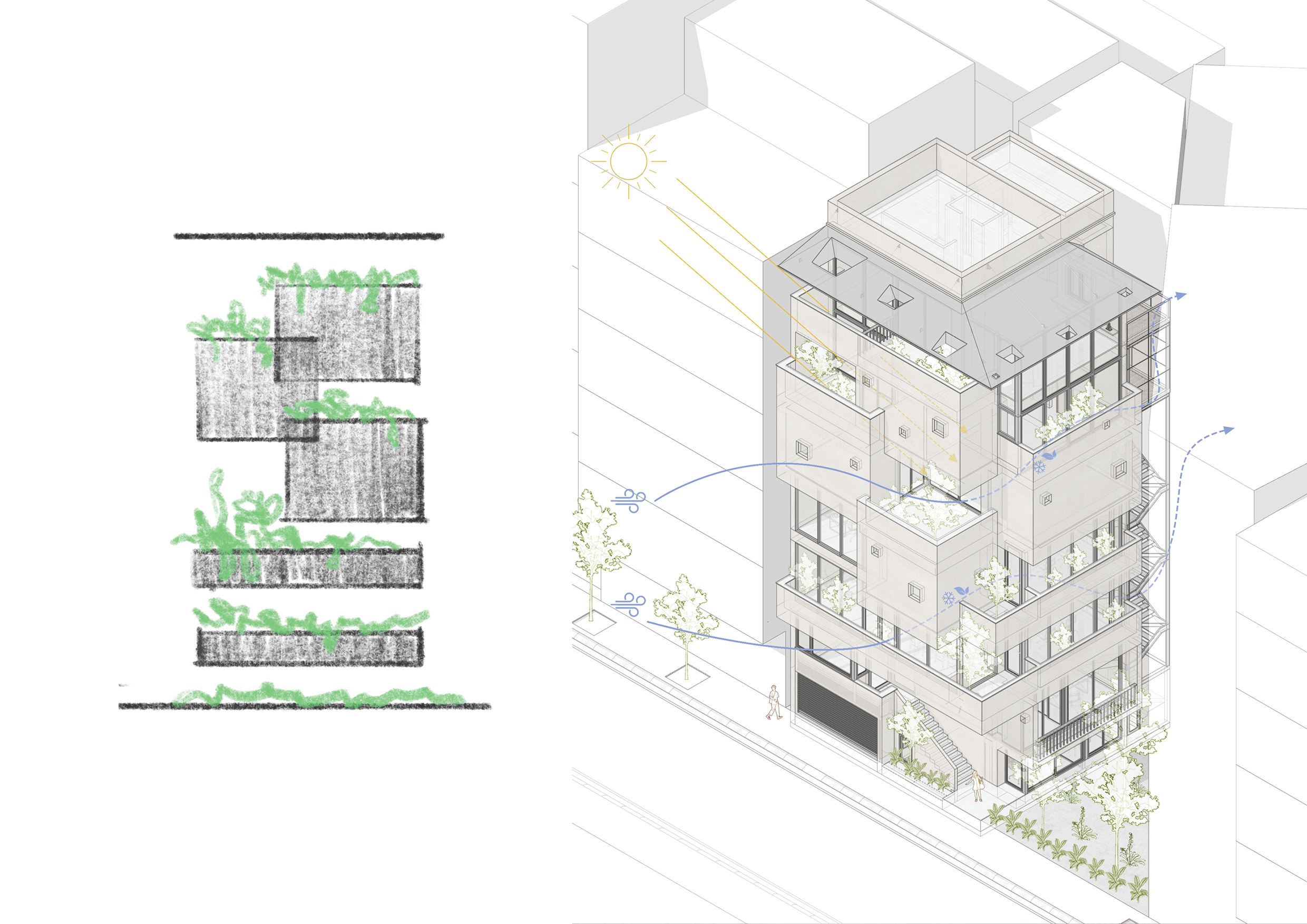 Thay vì tận dụng tối đa diện tích xây dựng, thiết kế tập trung tối ưu hóa công năng bên trong để chủ động chừa lại các khoảng lùi ở mặt tiền. Chuỗi khoảng lùi này trở thành chiến lược tổ chức không gian chính, cho phép hình thành các sân vườn, ban công và không gian ngoài trời xen kẽ theo chiều cao công trình. Kiến trúc được hình dung như các khối không gian xếp chồng và trượt lên nhau, trong đó mỗi khối không chỉ là không gian sử dụng mà còn đồng thời đóng vai trò là mái, sân hoặc vườn cho khối phía dưới.