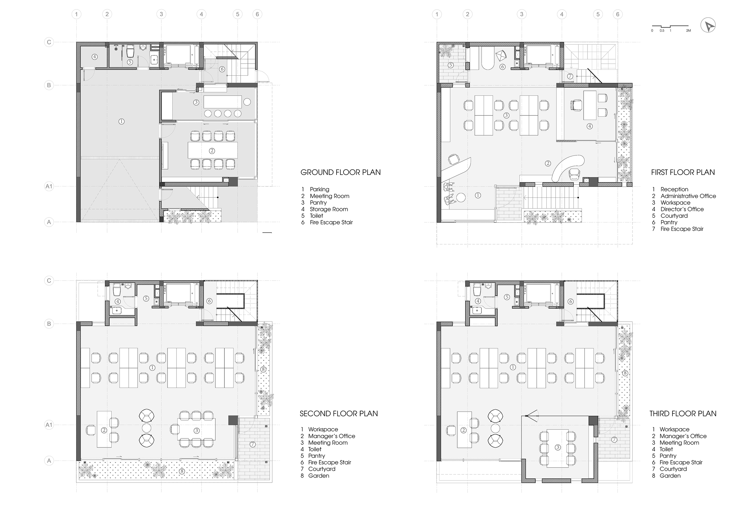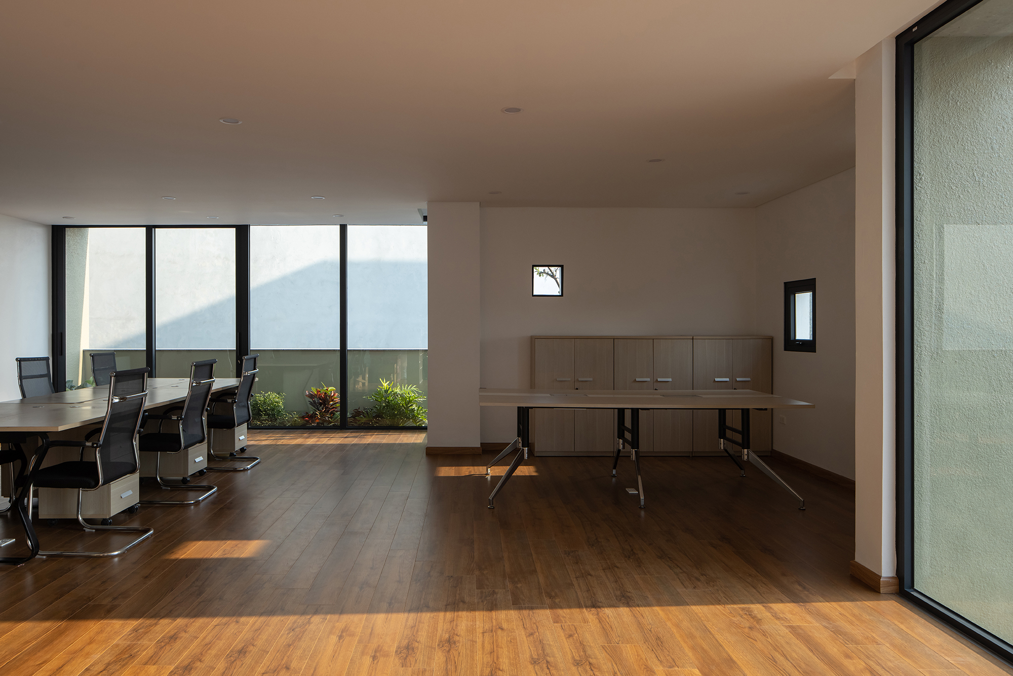 Các tầng dưới được bố trí làm văn phòng với mặt bằng mở, kết nối trực tiếp với các khoảng xanh phía trước, tạo môi trường làm việc thông thoáng và dễ chịu. Các tầng ở phía trên có tính khép kín hơn, tiếp nhận ánh sáng và gió gián tiếp thông qua các khu vườn và không gian đệm thay vì mở trực tiếp ra phố. Những không gian sinh hoạt chính đều gắn liền với các sân vườn trên cao, mang lại cảm giác sống gần gũi với thiên nhiên ngay trong bối cảnh đô thị mật độ cao.