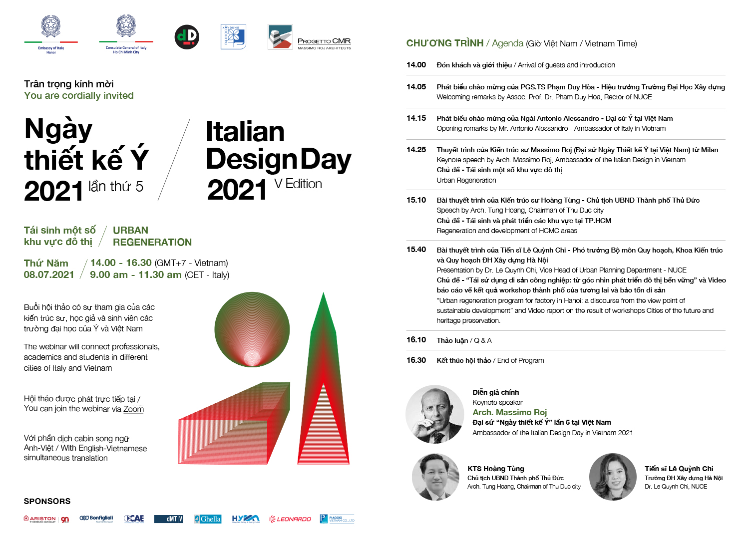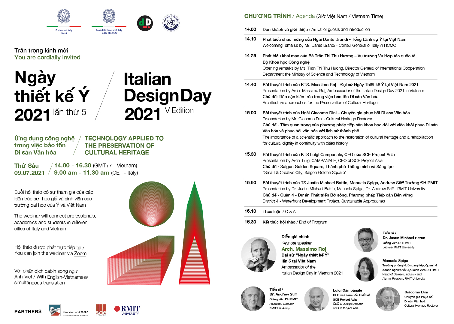 Tháng 7 năm nay, Ngày Thiết kế Ý (Italian Design Day) lần thứ 5 trở lại Việt Nam với chủ đề “Tái sinh một số khu vực đô thị” (Urban Regeneration) và “Ứng dụng công nghệ trong việc bảo tồn di sản văn hóa” (Technology applied to the preservation of Cultural heritage).