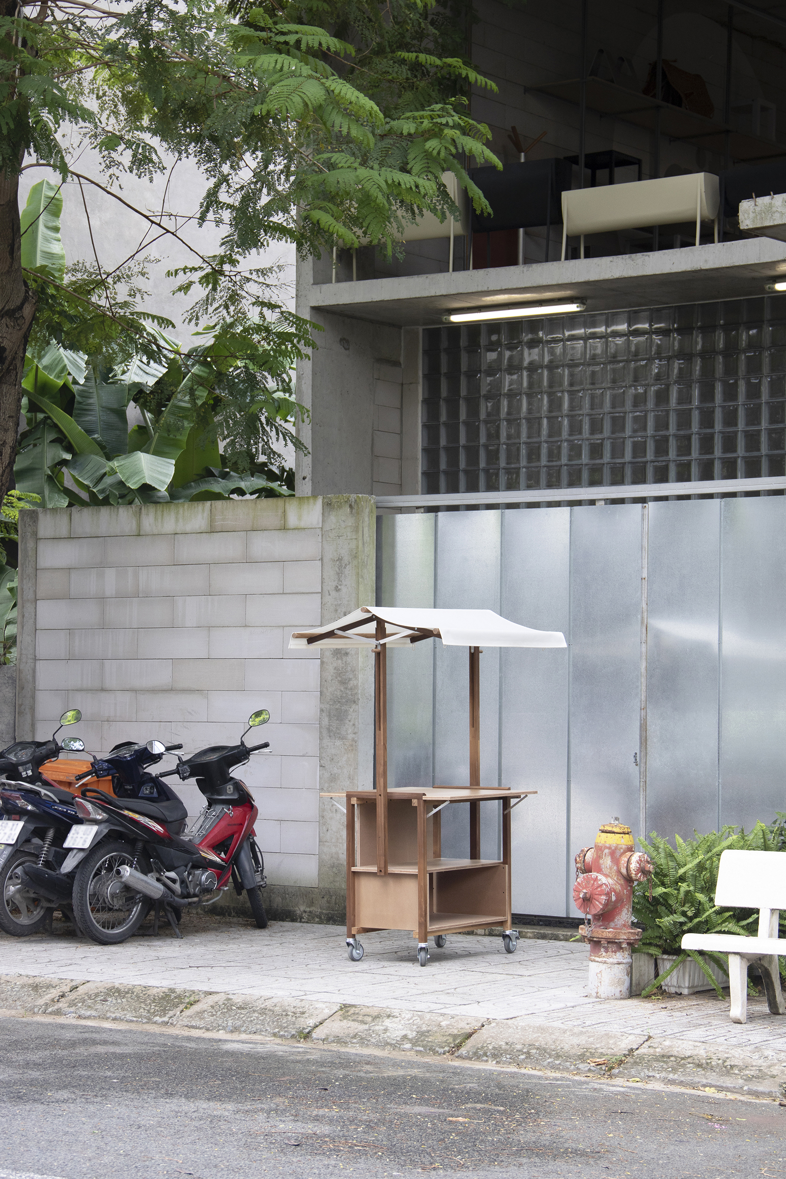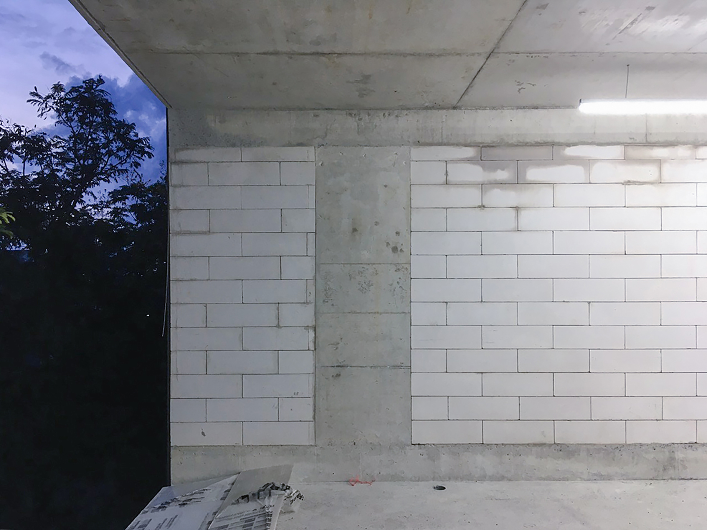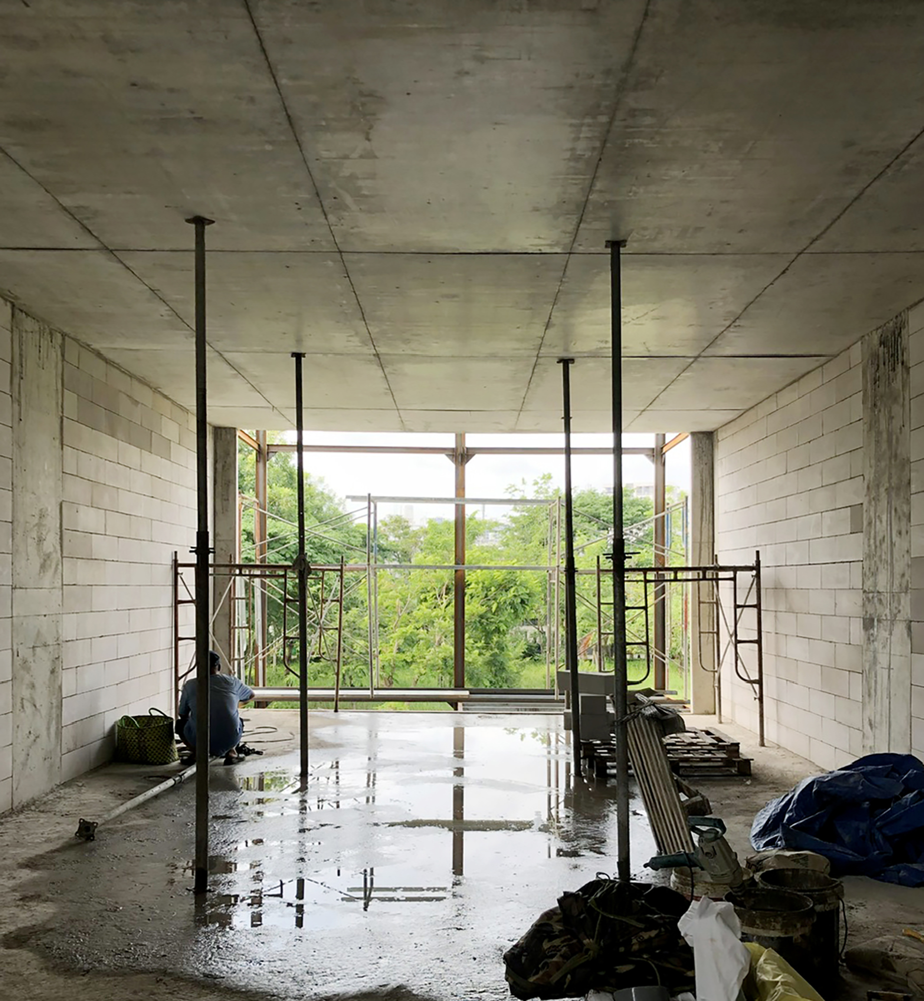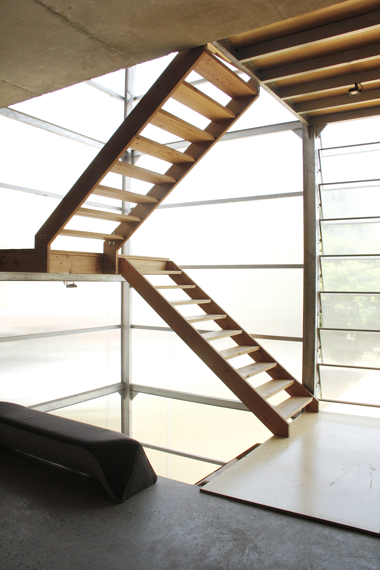 Phương pháp xây dựng đơn giản, tiết kiệm và thông minh là tiêu chí được đặt ra ngay trong giai đoạn thiết kế ý tưởng. Công trình sử dụng các vật liệu sẵn có như bê tông tại chỗ và ván ép công nghiệp được tái sử dụng từ các triển lãm trước đó. Khung thép cũng được tái sử dụng từ giai đoạn xây dựng thô của công trình (J4 Office) đảm bảo tính toàn vẹn về mặt cấu trúc, trong khi các lớp tường polycarbonate và kính trong suốt ở cả hai mặt trước sau tận dụng ánh sáng tự nhiên và kết nối nội thất với các không gian xanh xung quanh của khu dân cư.