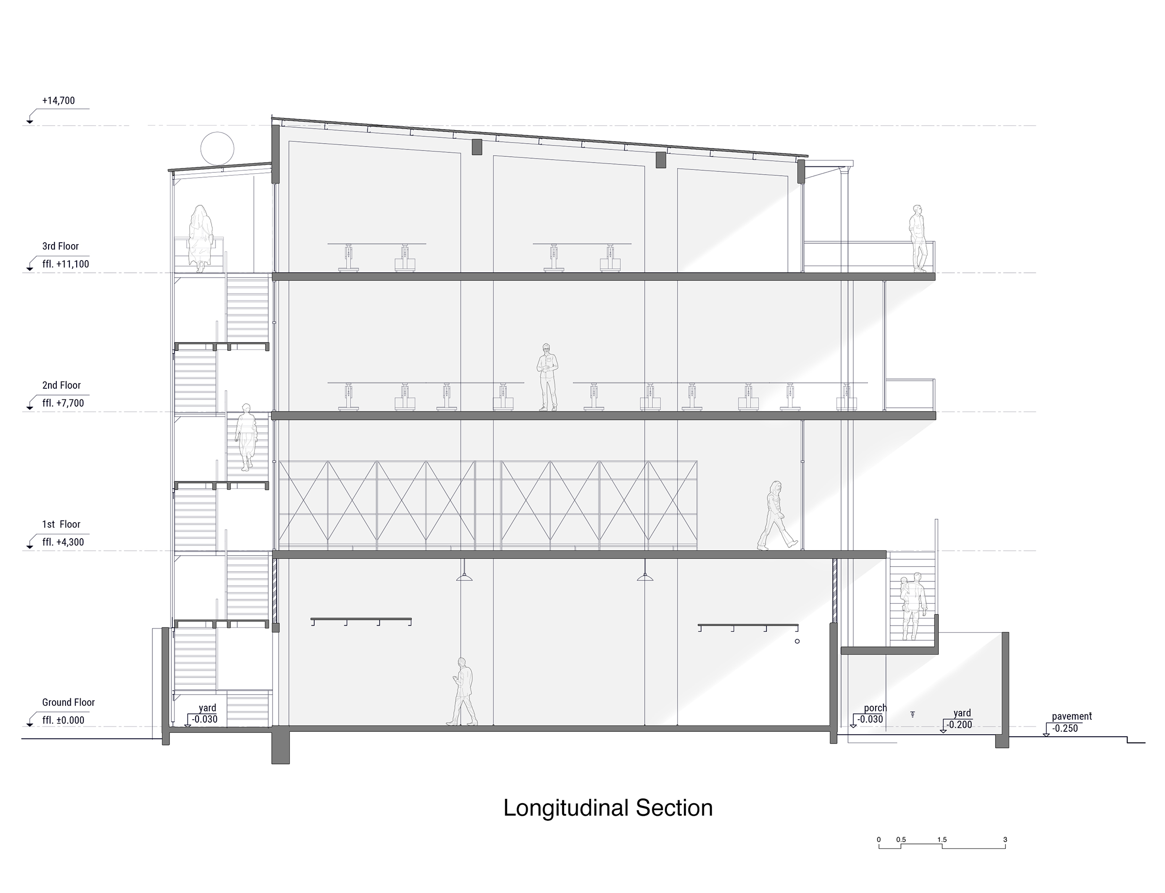 J4 hình dung ra một nơi làm việc được kết nối theo chiều dọc mang tính biến đổi. Đây cũng chính là trung tâm thiết kế liên ngành bao gồm bốn tầng, tối ưu hóa diện tích sử dụng, cung cấp một tổng diện sàn hơn 400 m2 với các không gian làm việc linh hoạt và đa dạng. Tầng trệt chuyển đổi từ khu vực Nghiên cứu và Phát triển (R&D) thành không gian trưng bày thiết kế tại tầng 2, trong khi các tầng trên tiếp tục là sự chuyển tiếp liền mạch giữa các xưởng (workshop) thiết kế (tầng 3) và xưởng may, bọc vải và chụp hình sản phẩm (tầng 4).