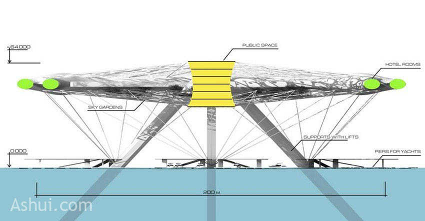 Kiến trúc sư Alexander Asadov đã tạo ra một công trình không tưởng tuyệt vời pha lẫn giữa thiết kế thời đại không gian tương lai và một trung tâm bảo tồn các hệ sinh thái mong manh nhất của thiên nhiên. Thoạt nhìn trông giống như một cái gì đó đi trước thời đại cả bao thập niên, Khách sạn nổi Aerohotel là một kết cấu nhân tạo lơ lửng, lượn trên mặt nước như một hòn đảo nhân tạo, đây sẽ là nơi bố trí các không gian chung, những khu vườn, khách sạn và các không gian thương mại khác mà không ảnh hưởng gì đến tiến trình tự nhiên.