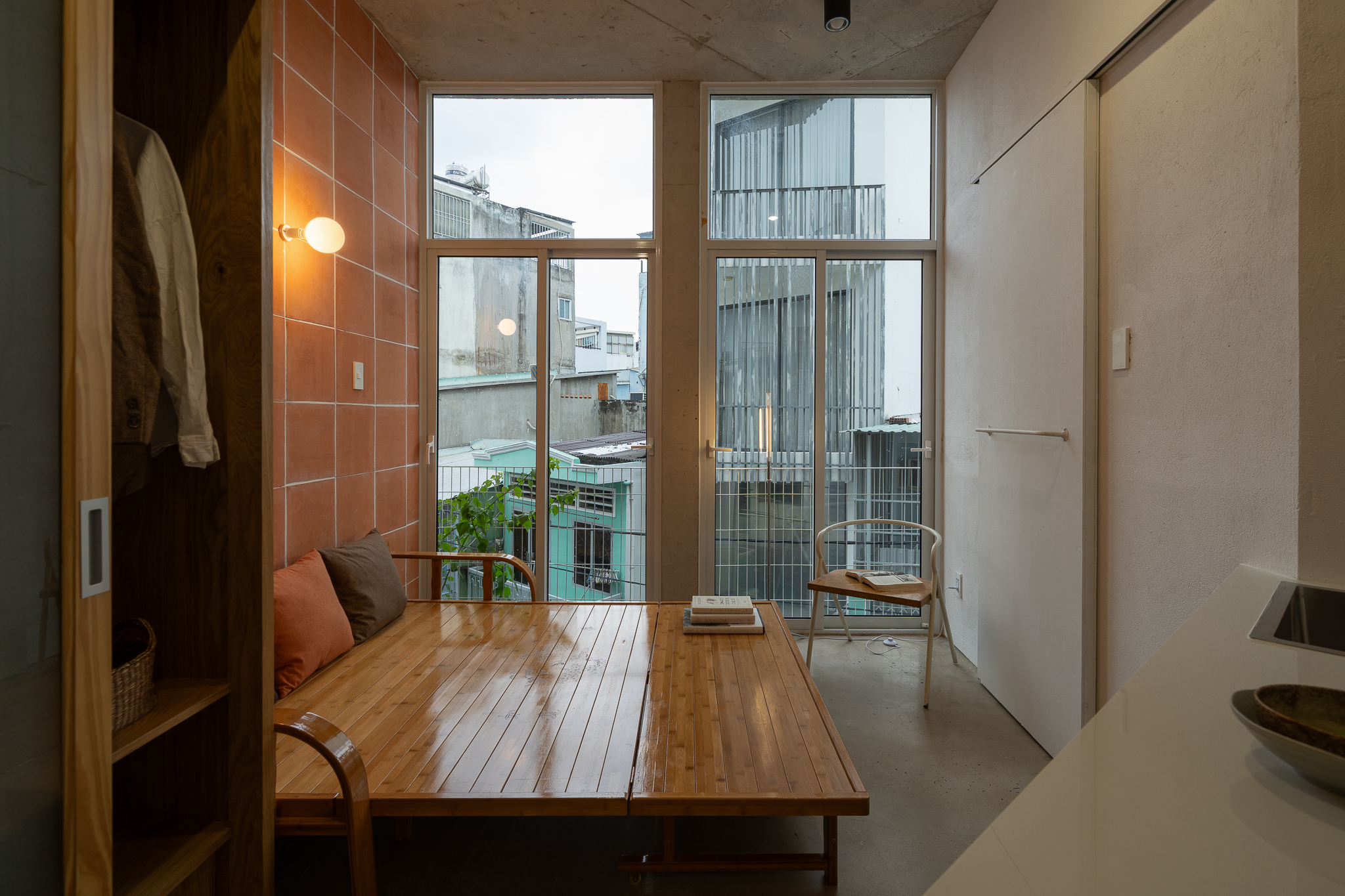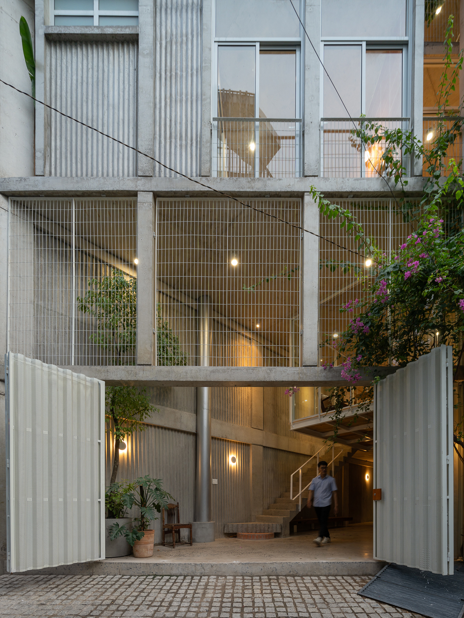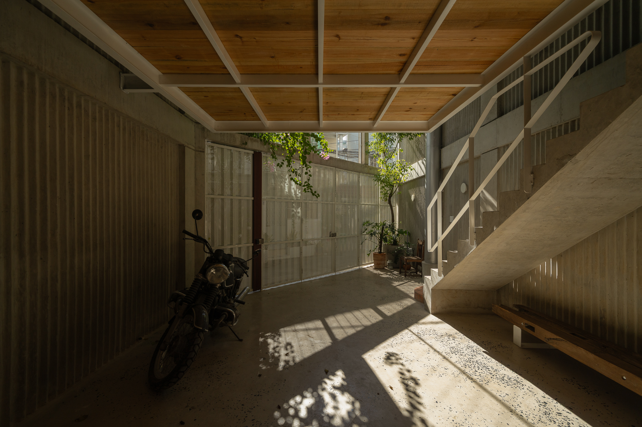 Từ đó, tầng trệt và tầng lửng được giữ thông thoáng với các vách ngăn tối thiểu, tạo sự chuyển tiếp liền mạch từ ngõ vào nhà. Cổng và cửa lưới thép tăng cường sự thông thoáng, xóa nhòa ranh giới giữa nhà và ngõ. Khoảng trống đóng vai trò là vùng chuyển tiếp giữa bên trong và bên ngoài, được thiết kế như một không gian sinh hoạt chung linh hoạt, trở thành điểm kết nối chính cho cư dân.