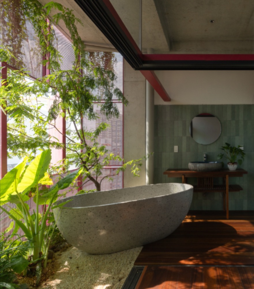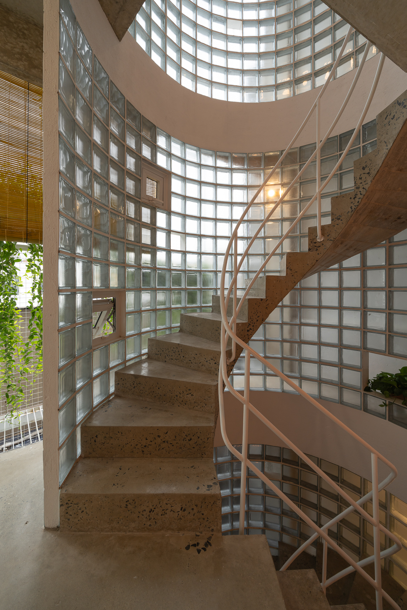 Cây xanh được đan xen khắp các khoảng trống, làm mát không khí, tăng thêm sự riêng tư và đưa ngôi nhà đến gần hơn với thiên nhiên. Cầu thang không chỉ đóng vai trò là trục lưu thông chính mà còn là trục thông gió của ngôi nhà. Các bậc thang rỗng tăng cường lưu thông không khí theo chiều dọc, cho phép ngôi nhà được “thở” một cách tự nhiên.