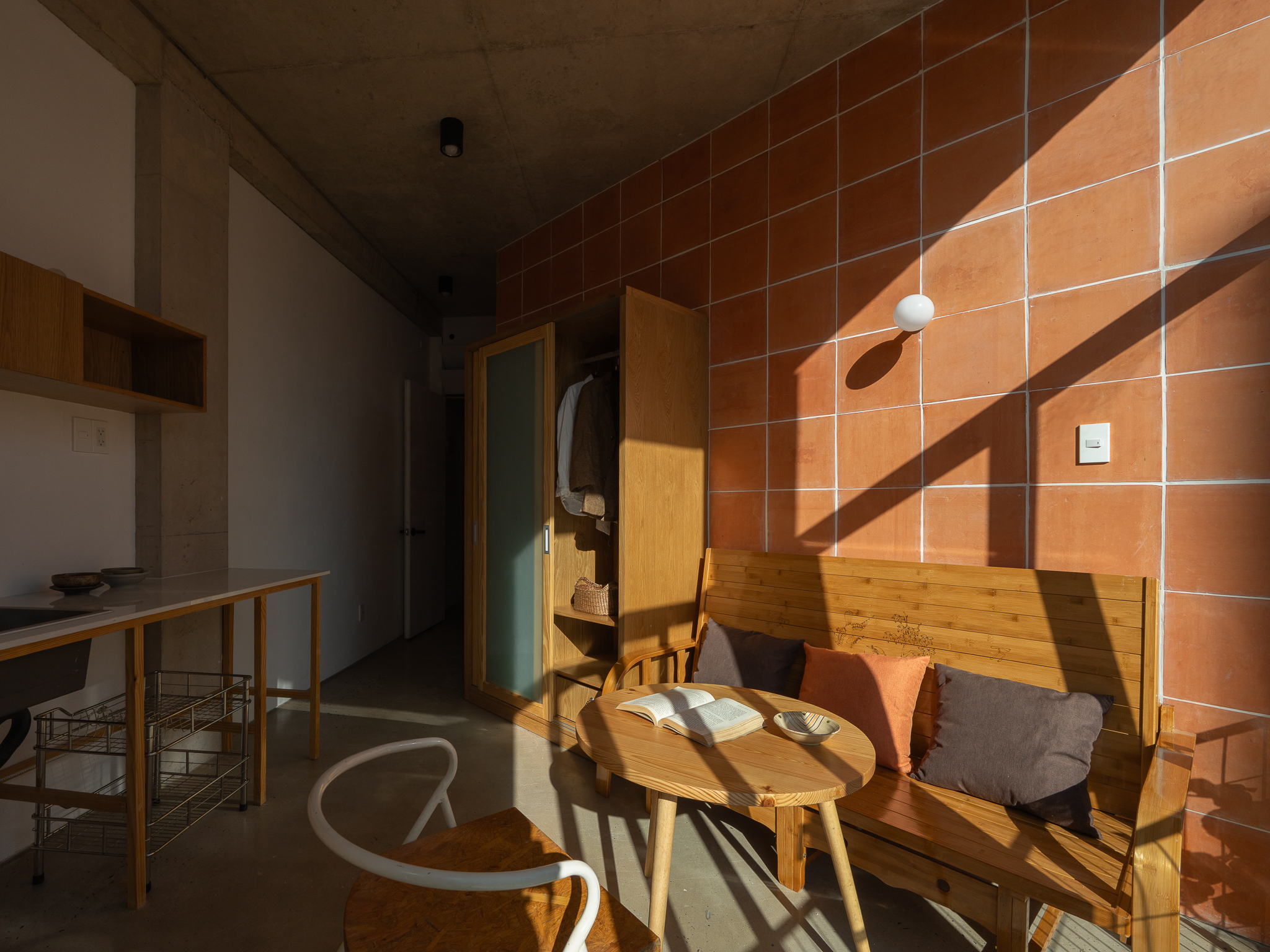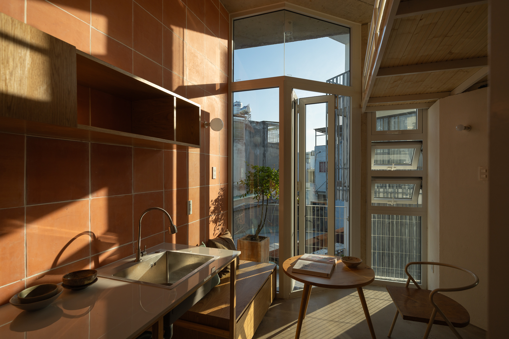 Sảnh tầng được thiết kế như một không gian bán công cộng, giúp cải thiện luồng không khí và tầm nhìn thoáng đãng, đồng thời mở rộng căn hộ cho các hoạt động như tiếp khách, đọc sách hoặc các hoạt động khác trong một khu vườn xen kẽ.
